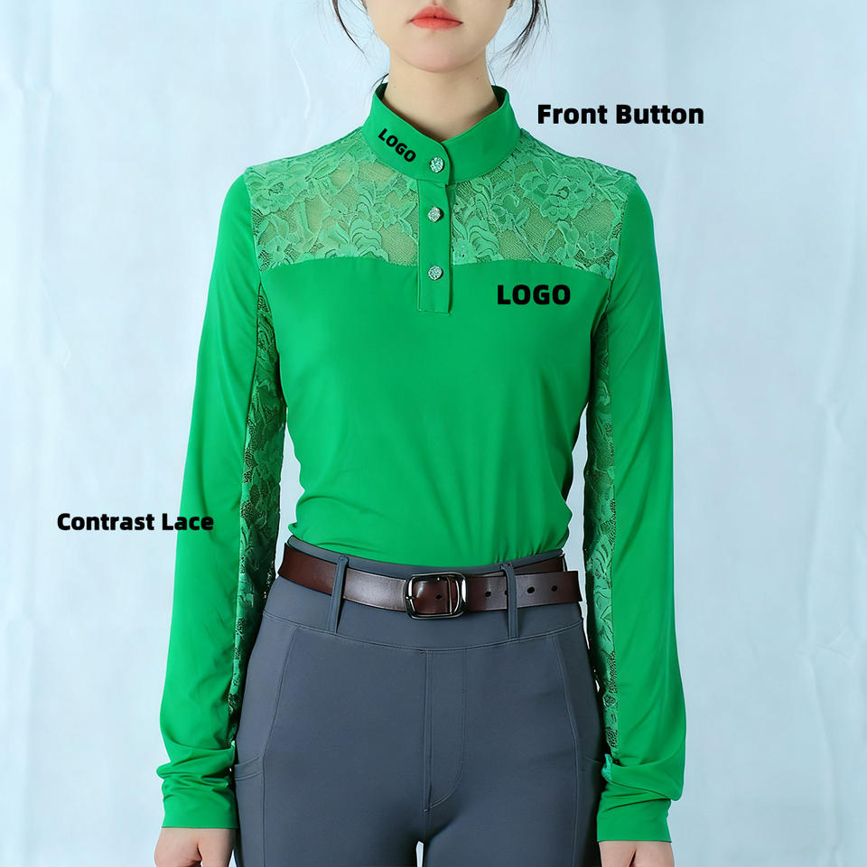 Green Horse Riding Shirt Long Sleeve Equestrian Tops Lace Equestrian Shirt Mesh Women Stand Collar Equestrian Competition Shirt