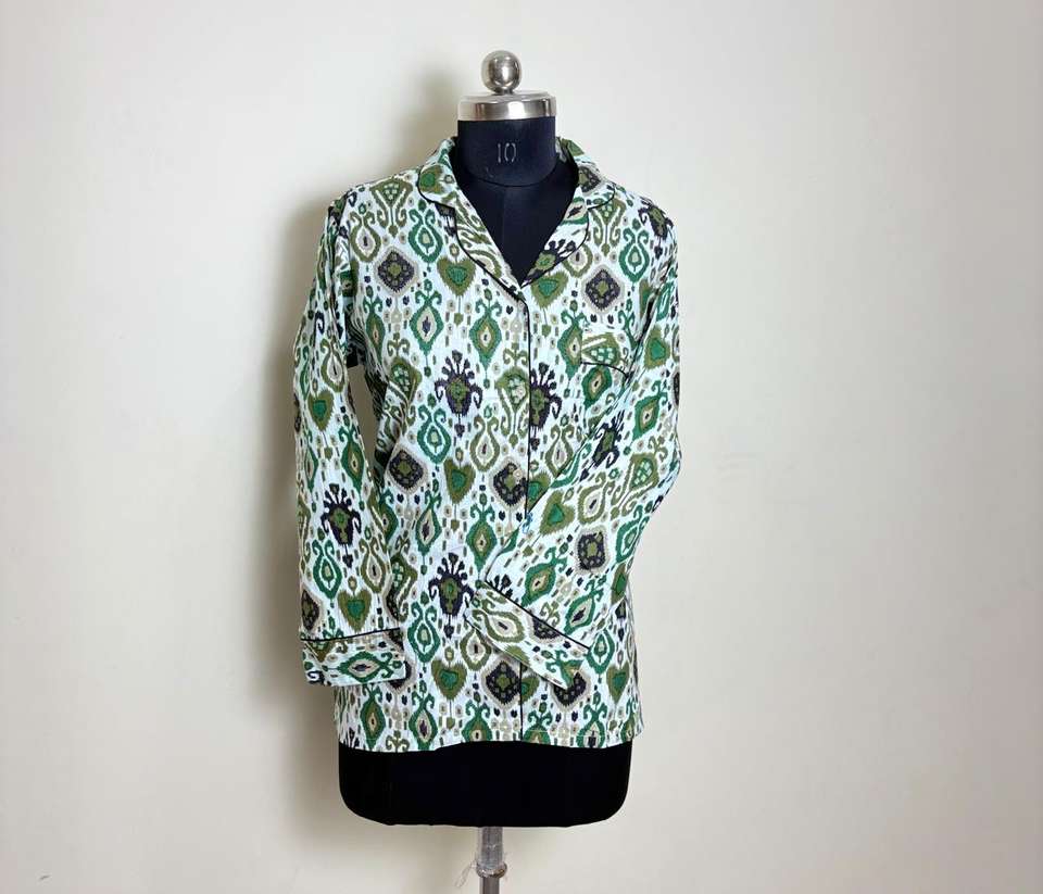เสื้อพิมพ์ลาย Ikat สีเขียวสำหรับผู้หญิง, เสื้อผ้าฝ้ายลำลองพิมพ์ลายสไตล์โบฮีเมียน Ikat สีเขียวแขนยาว
