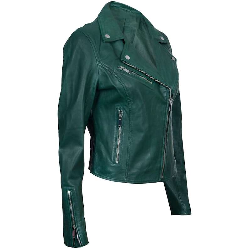 แจ็คเก็ตหนังแกะสีเขียวทรงนักขี่มอเตอร์ไซค์: ทรงเข้ารูปสไตล์นักแข่ง