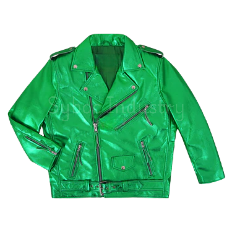 แจ็คเกอร์นักขี่จักรยานหนังสีเขียวสำหรับผู้ชายแจ็คเก็ตหนังเมทัลลิกไซส์ใหญ่พิเศษวินเทจสำหรับเด็กผู้ชาย