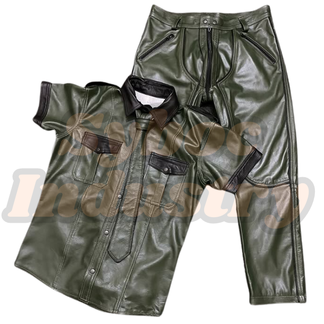 Green Leather Uniform For Adult Real Cowhide Plus Size Leather Shirt Stylish Breeches Leather Gay Pant For Boys