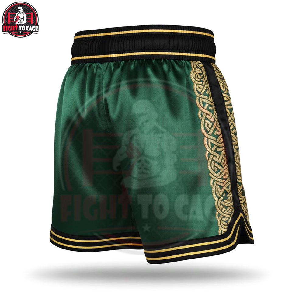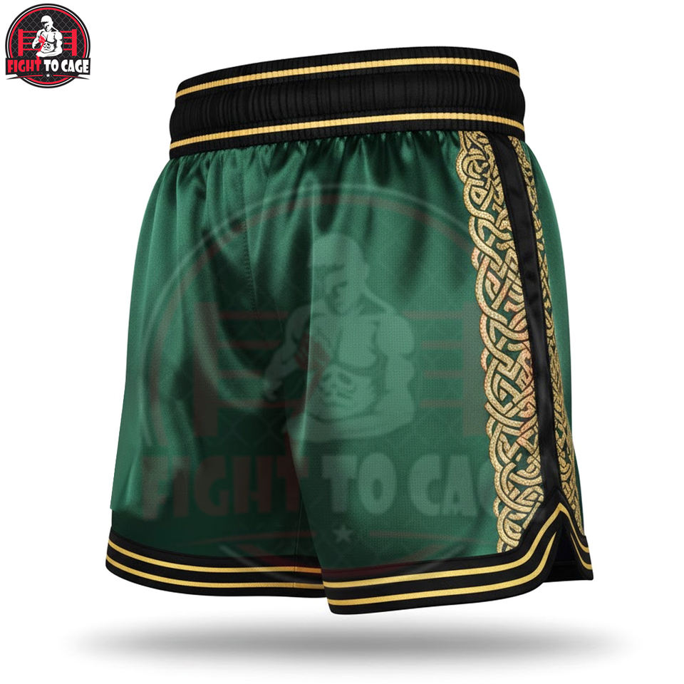 กางเกงชกมวยสีเขียวเมทัลลิกทอง คุณภาพพรีเมียม ผลิตจากโพลีเอสเตอร์ระบายอากาศได้ดี รับผลิตแบบ OEM/ODM พร้อมบริการสกรีนโลโก้ สำหรับมืออาชีพ