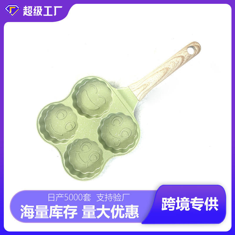 กระทะไข่สี่หลุมเคลือบสารกันติดสีเขียวพร้อมด้ามจับไม้สำหรับทำอาหารเช้า