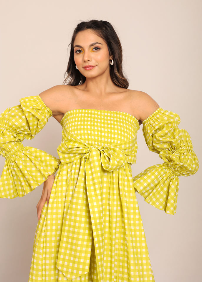 ชื่อผลิตภัณฑ์:เดรสมิดิแขนจีบเปิดไหล่สีเขียว
