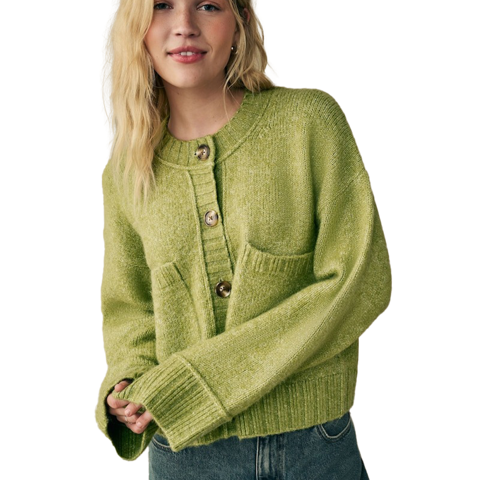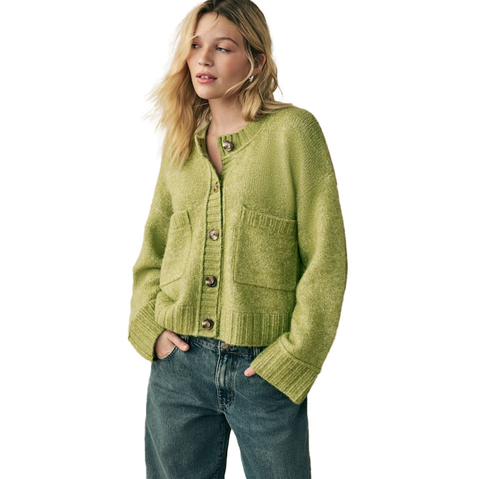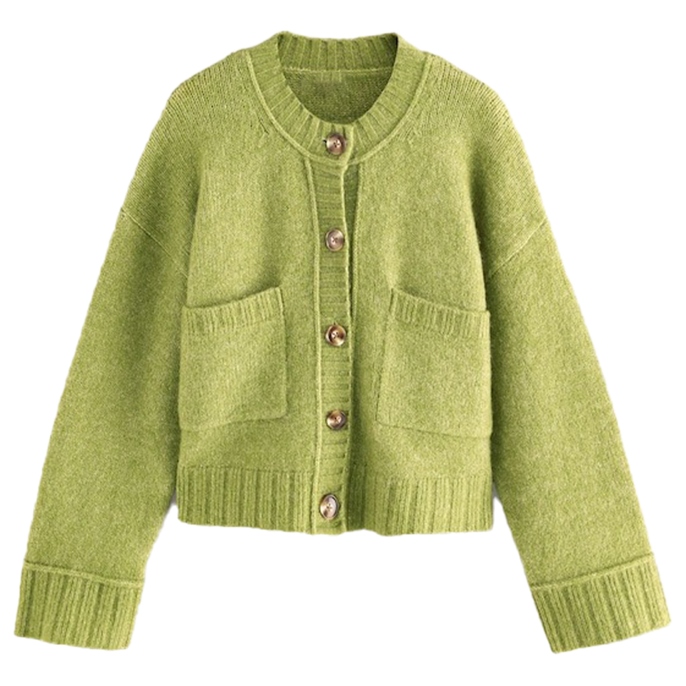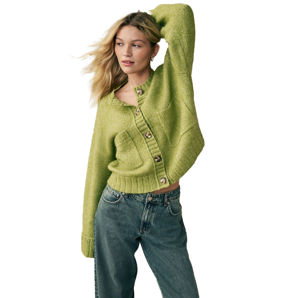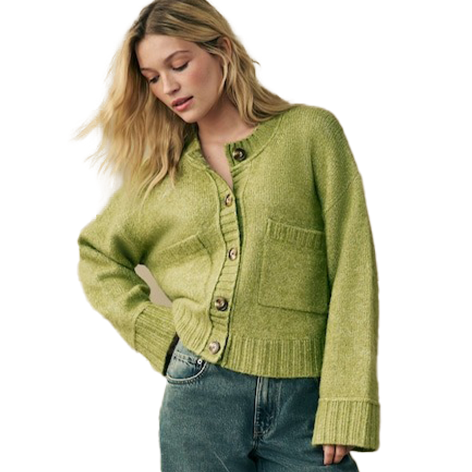เสื้อคาร์ดิแกนไหมพรมผสมขนสัตว์สำหรับผู้หญิงแฟชั่นฤดูใบไม้ร่วงฤดูหนาว คอวี สีเขียวมะกอก เนื้อผ้านุ่ม กระดุมติดกระเป๋าด้านหน้า ดีไซน์ทันสมัย ถักนิตติ้ง