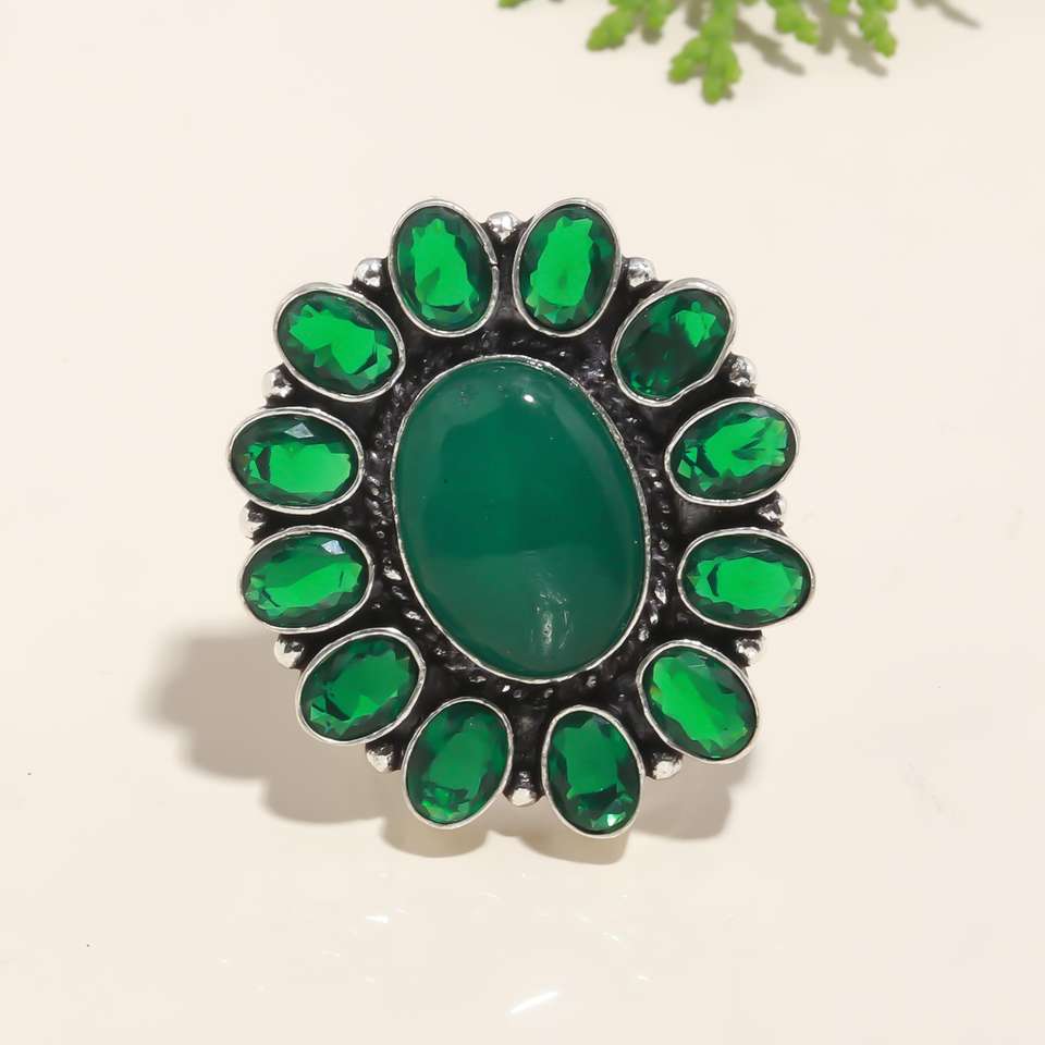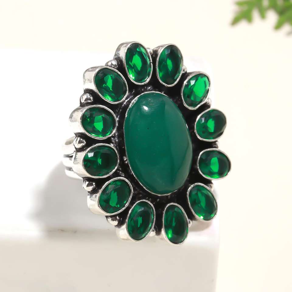 แหวน925ทำมือสำหรับผู้หญิงพลอยไดออปไซด์สีเขียวโอนิกซ์และโครเมี่ยมรูปดอกไม้ชุบเงินแหวนโบฮีเมียนสำหรับเธอ