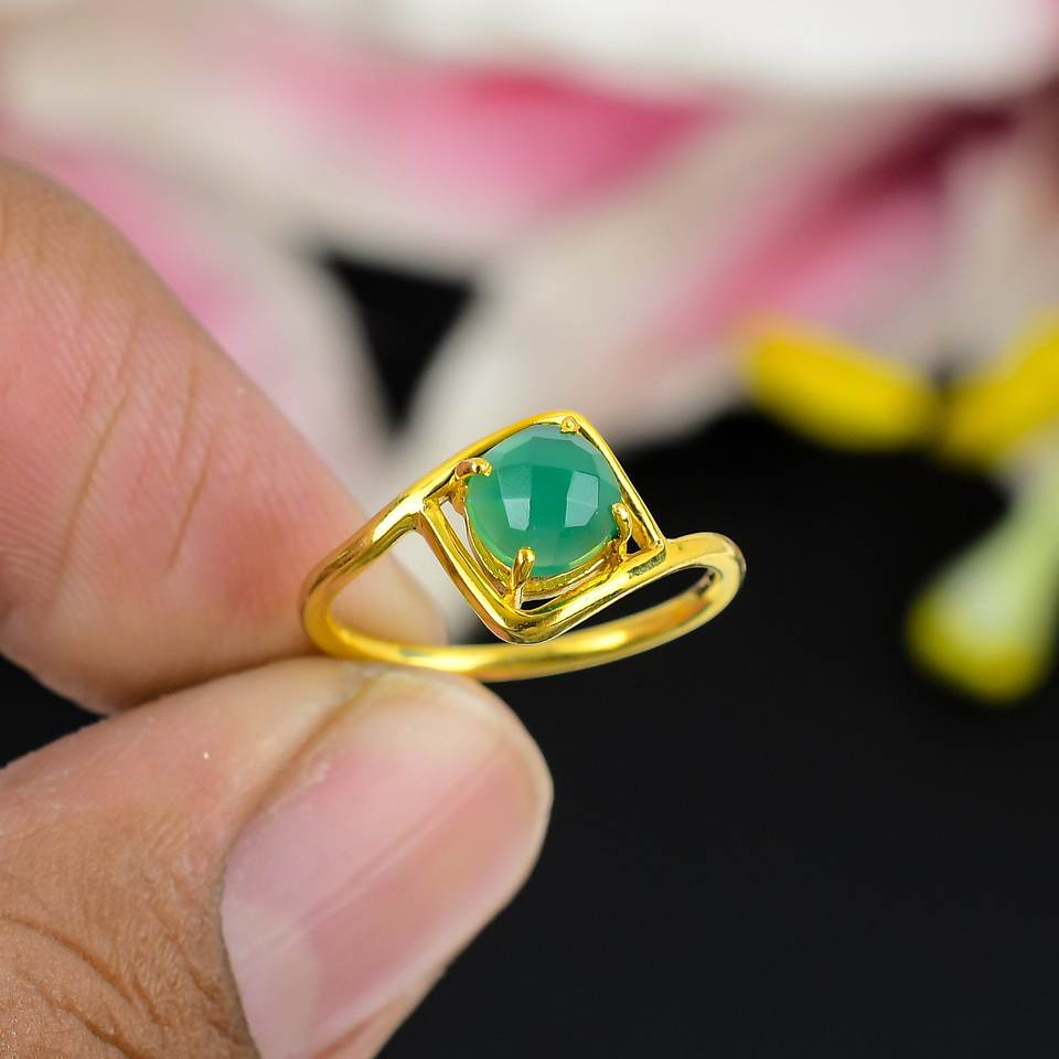 แหวนพลอยสีเขียวออนิกซ์ทรงคุชชั่น ชุบทอง งานแฮนด์เมด เครื่องประดับมินิมอลสำหรับผู้หญิง