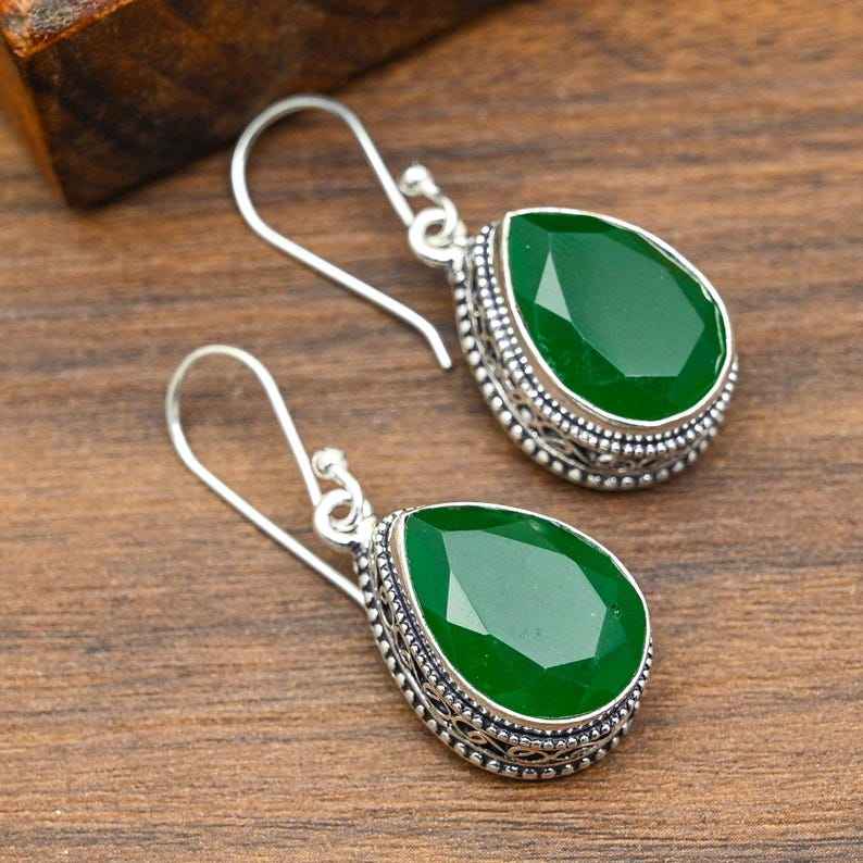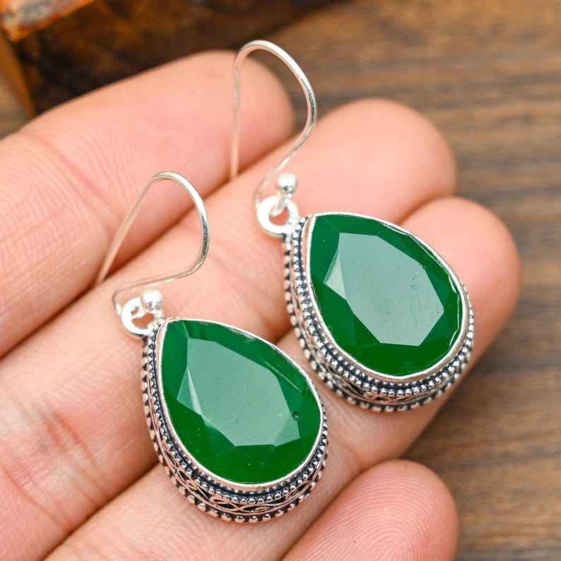 ต่างหูพลอยออนิกซ์สีเขียว เงินแท้ 925 ต่างหูเงินทำมือ เครื่องประดับพลอยธรรมชาติ ของขวัญแทนใจ
