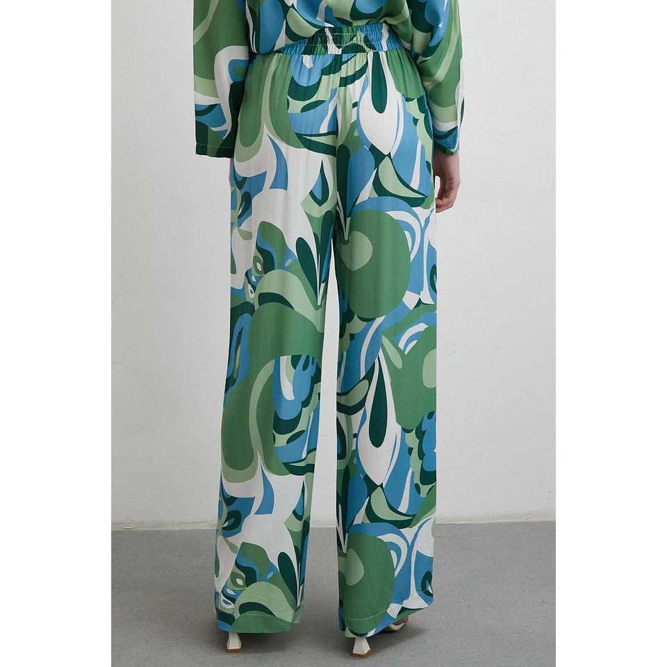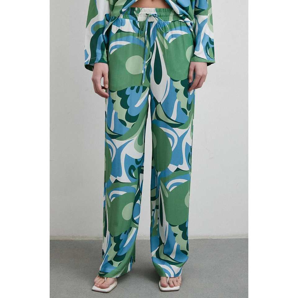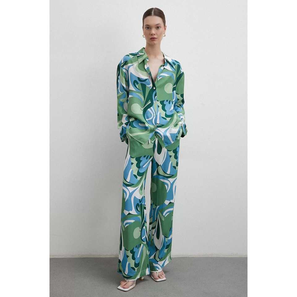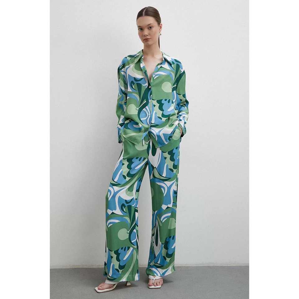 กางเกงขายาวลายสีเขียว ผ้าซาติน เอวกลาง ระบายอากาศได้ดี สำหรับผู้หญิง
