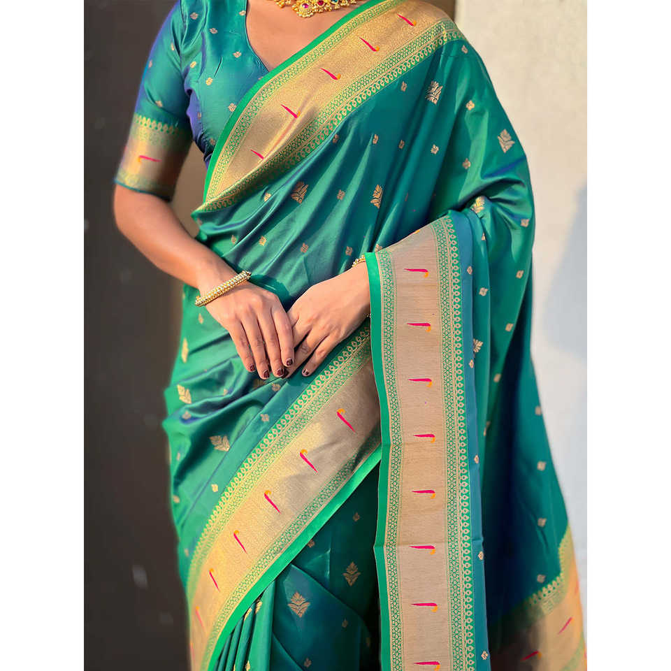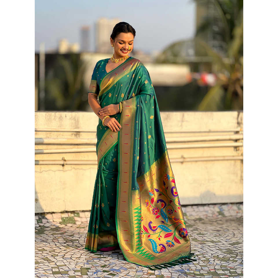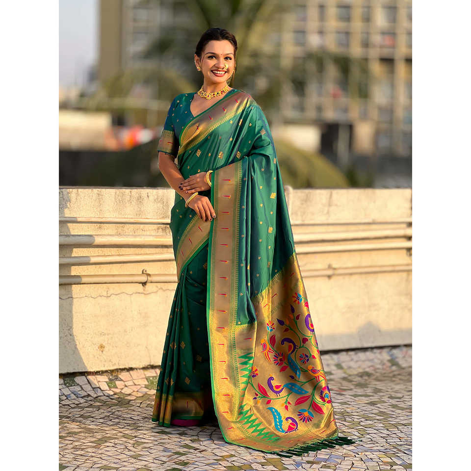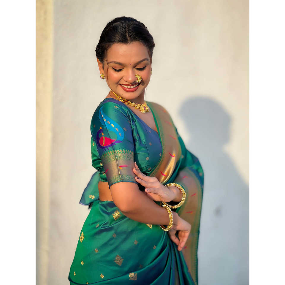 ผ้าซารีทอมือลายพิราบสีเขียวแบบพิเศษ พร้อมชุดเดรสคลับสุดหรู