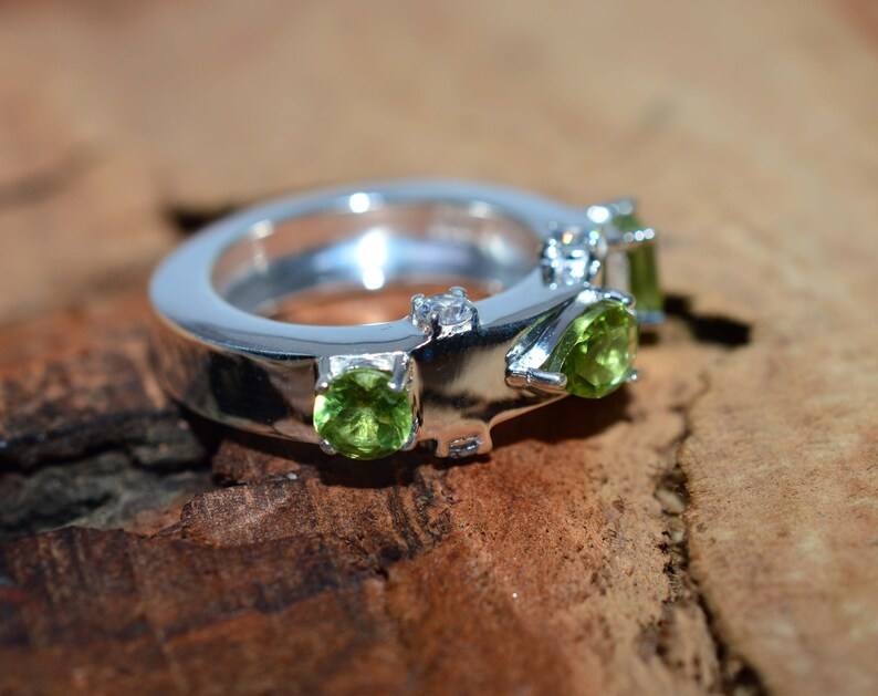 แหวนเพอริดอทด้านเหลี่ยมสีเขียวในเงินแท้ 925 ชุบแพลตตินัม ของขวัญเครื่องประดับผู้หญิงสุดอินเทรนด์