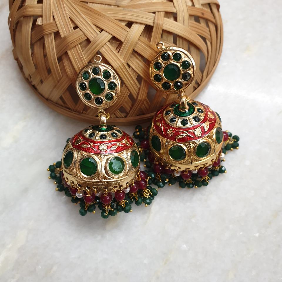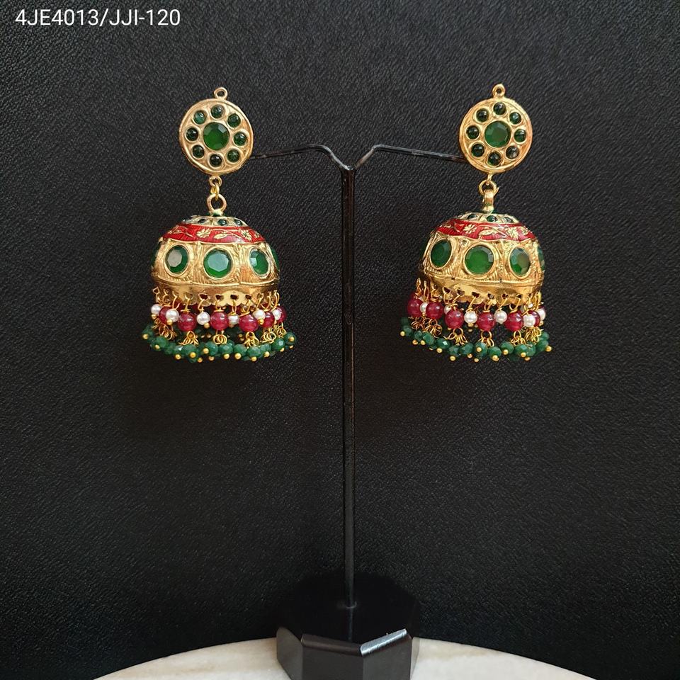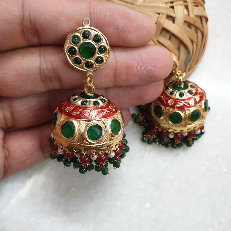 Jadau jhumki ต่างหูควอตซ์สีเขียวและเพชรต่างหูแบบห้อยสไตล์โรแมนติกปาร์ตี้งานแต่งงานทำจากทองเหลืองสังกะสีอัลลอยรูปแบบตัวเลข