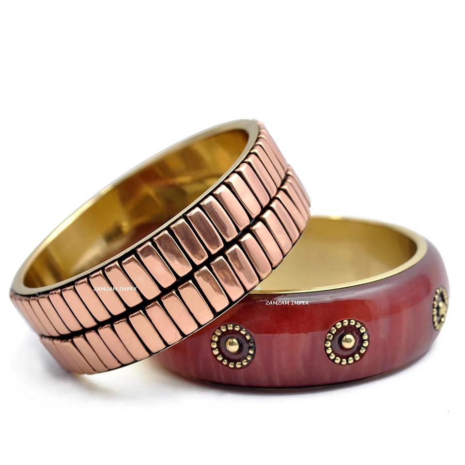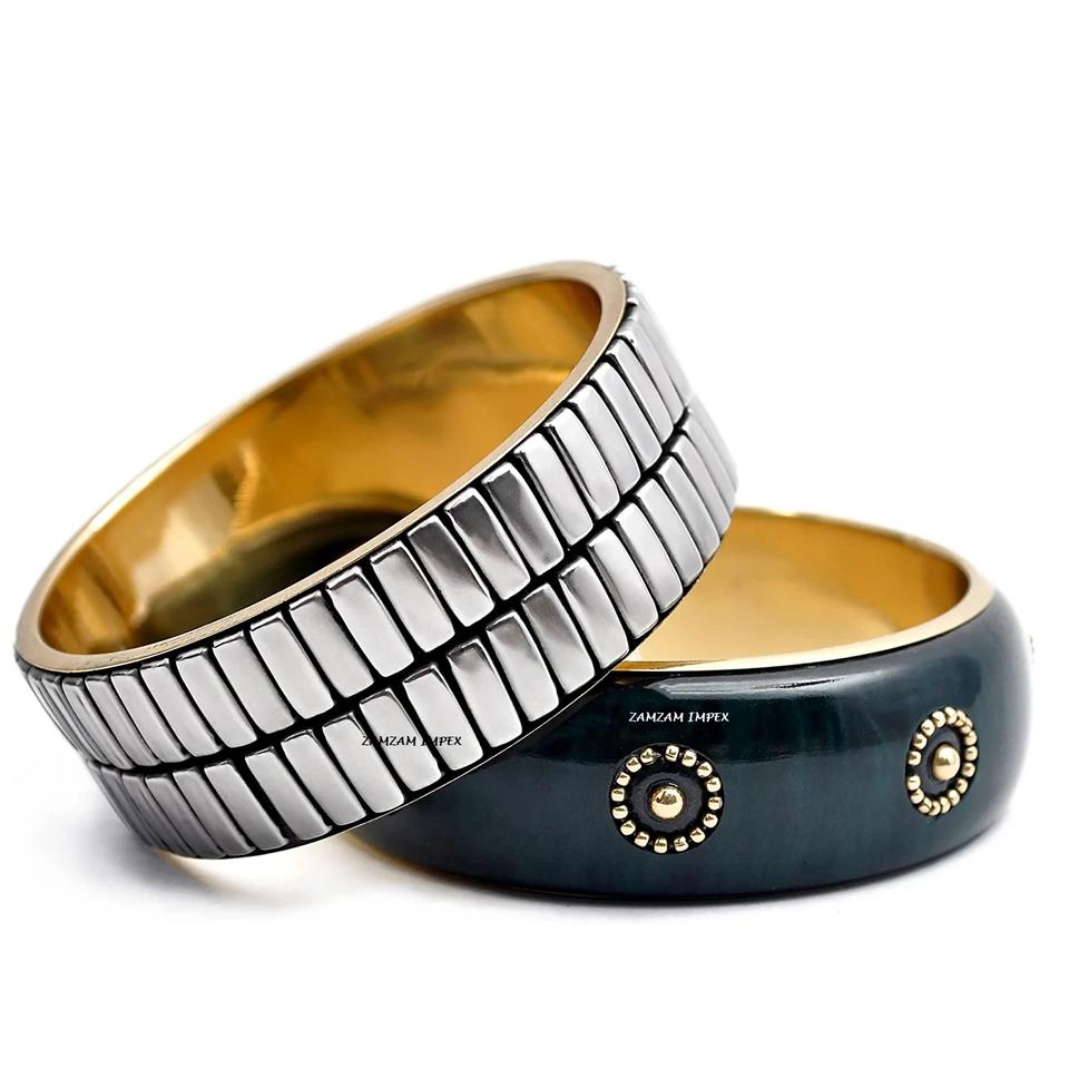 กำไลข้อมือทองเหลืองสีทองและทำจากเรซินสีเขียวพร้อมกำไลข้อมือที่มีลวดลายสลักศิลปะสำหรับสวมใส่ในแฟชั่นและหรูหรา