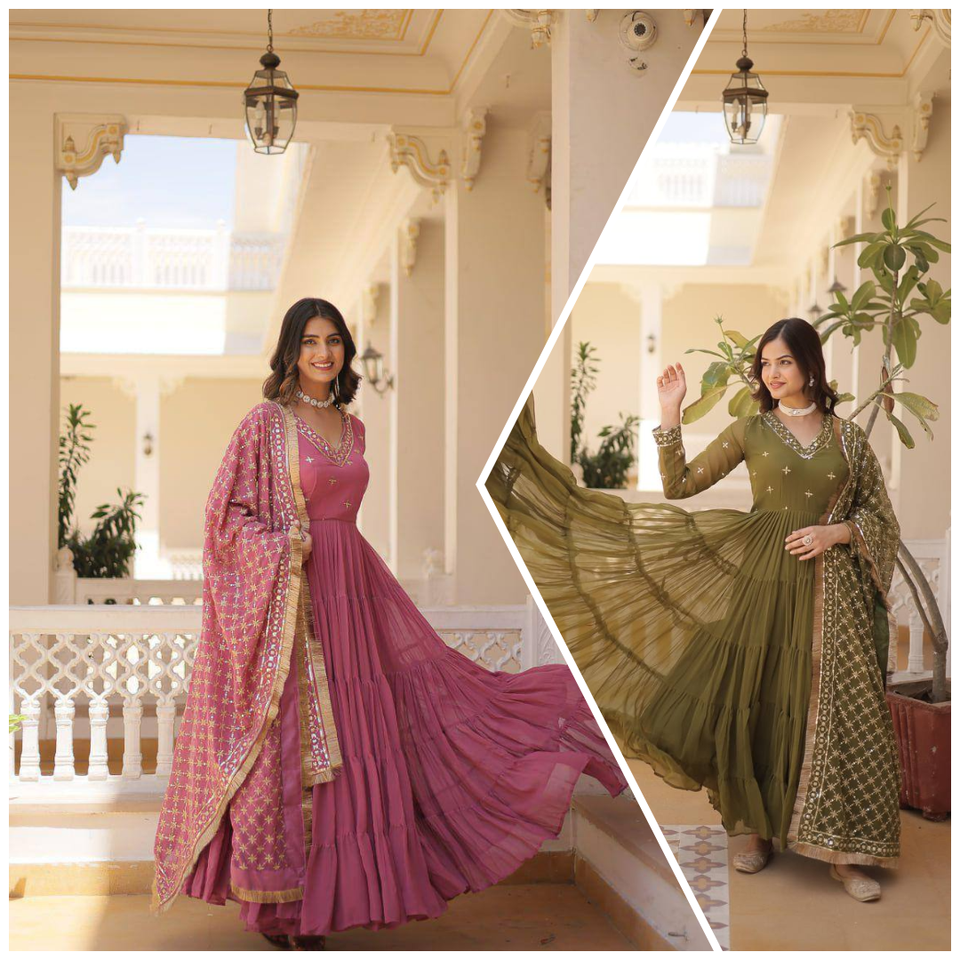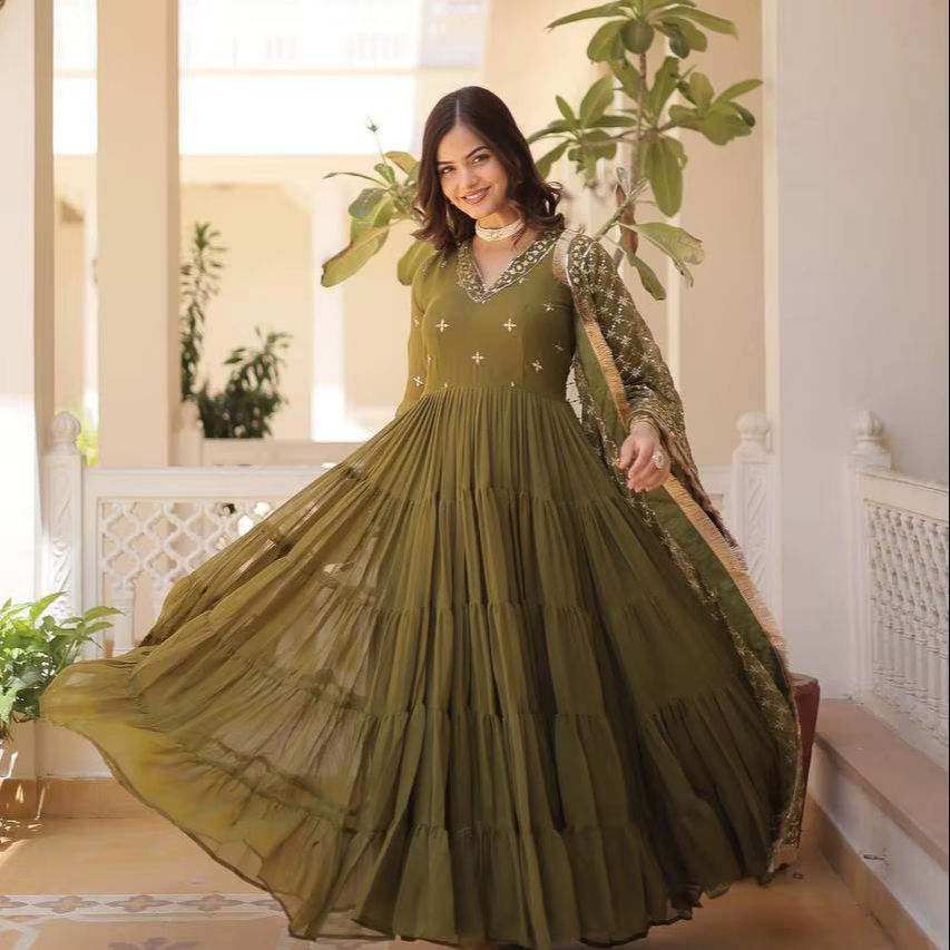 ชุดราตรียาวชุดแต่งงานอินเดียชุดอินเดียชุดกระโปรงยาวแต่งระบายสีเขียว