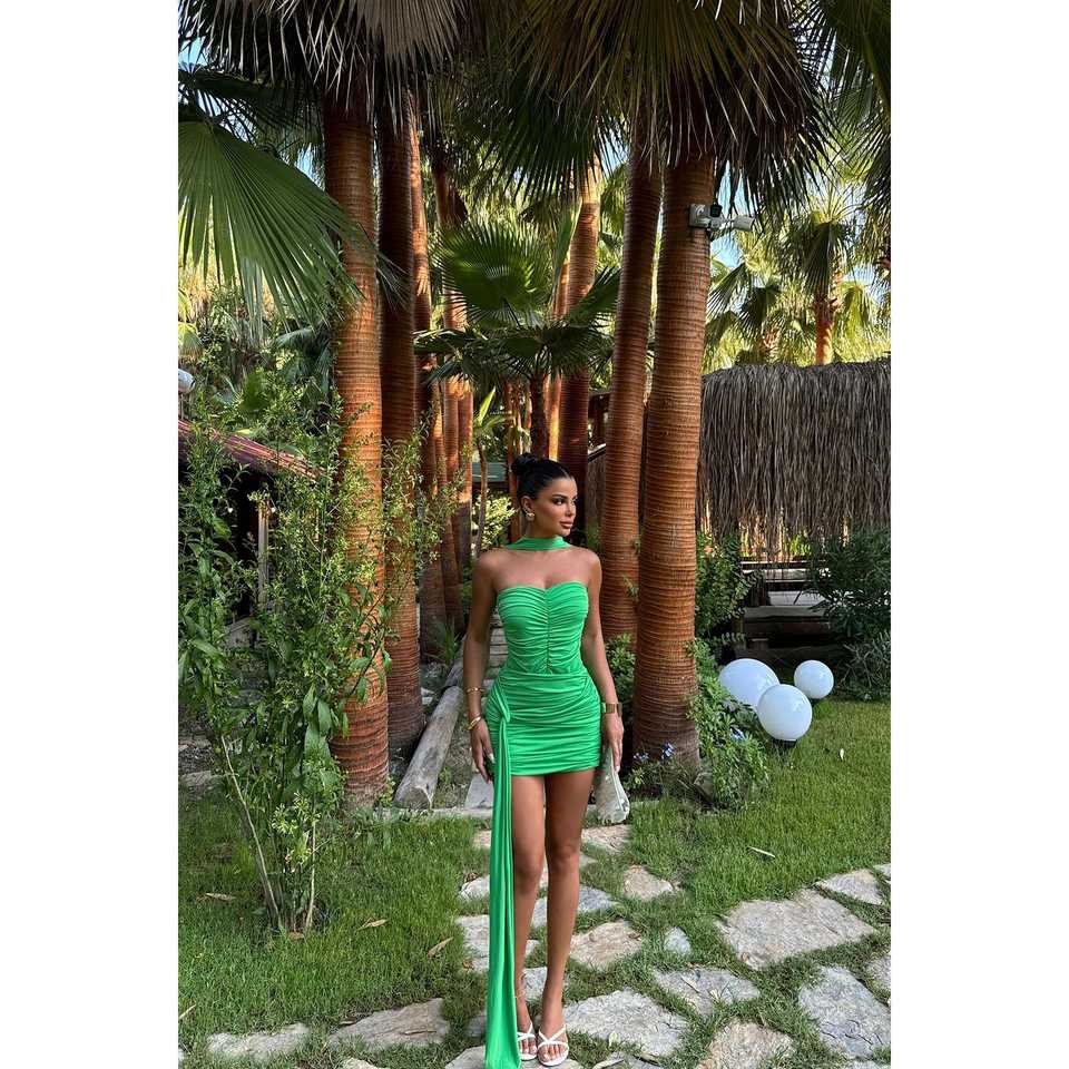 ชุดบอดี้สูทสีเขียวประดับเลื่อมพร้อมผ้าตกแต่ง