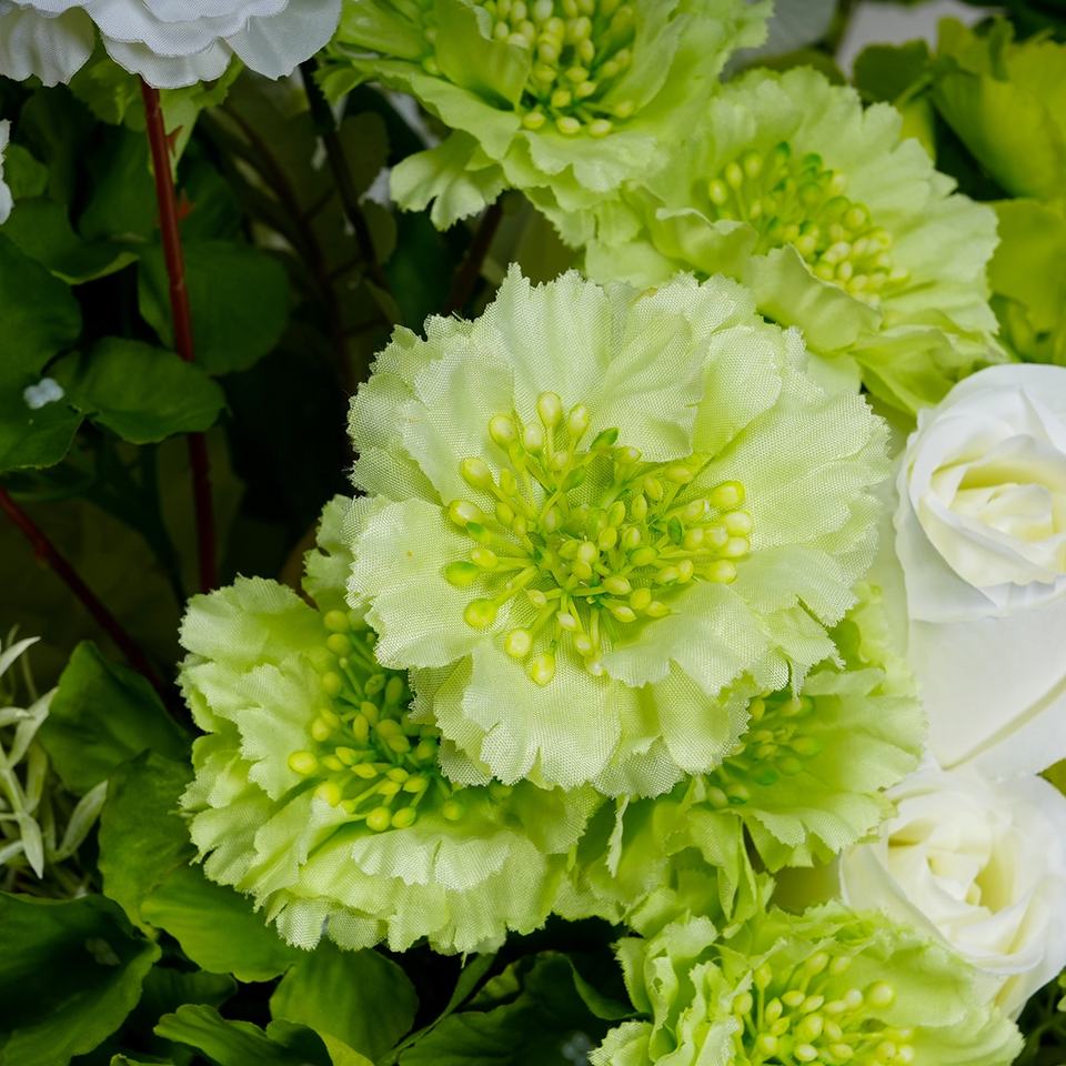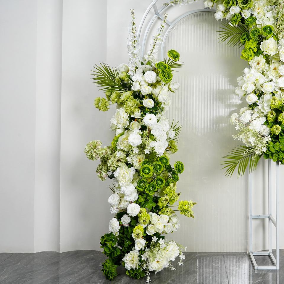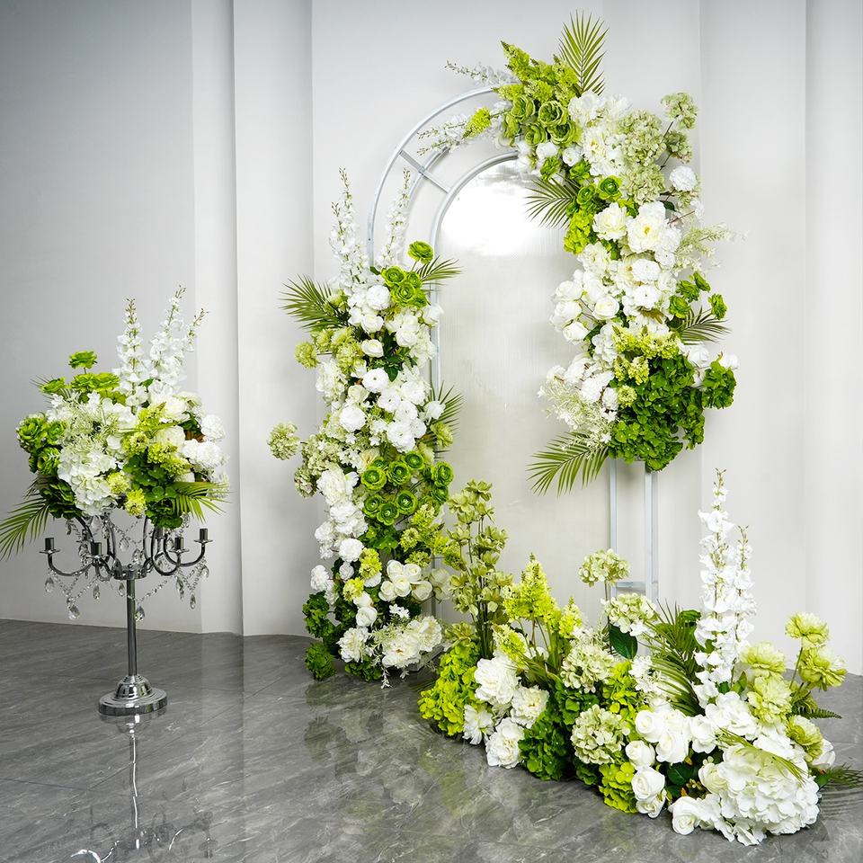 ชุดดอกไม้ประดิษฐ์สีเขียวใช้สำหรับตกแต่งเวทีงานแต่งงานพื้นหลัง