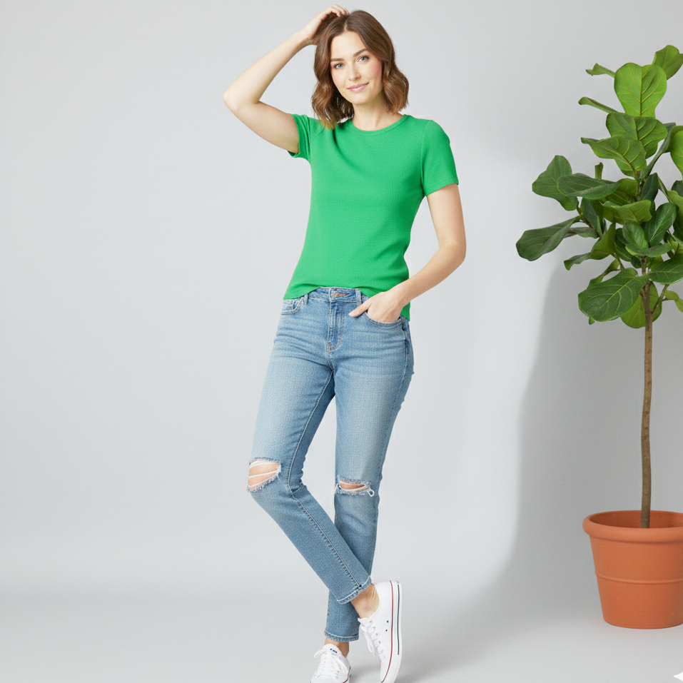 เสื้อยืดสีเขียวทรงพอดีตัวสำหรับผู้หญิง ผลิตจากวัสดุรักษ์โลก ระบายอากาศได้ดี แห้งเร็ว คอริบบ์ คุณภาพพรีเมียม ราคาโรงงาน
