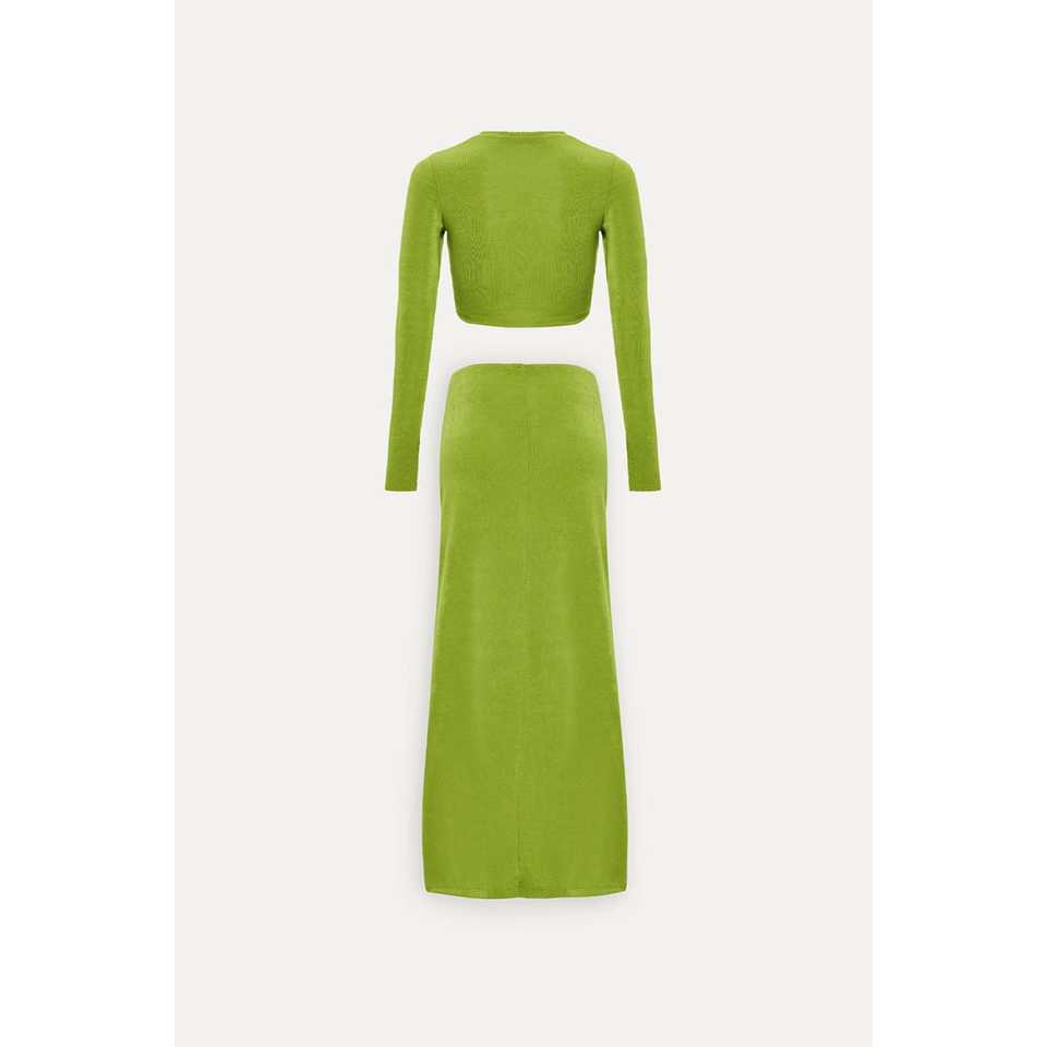 ชุดกระโปรงสองชิ้นสีเขียวเข้มทรงหลวม สไตล์ลำลองและเป็นทางการ เหมาะสำหรับฤดูร้อน เสื้อและกางเกงขาสั้น ผ้าถัก ความยาวเหนือเข่า