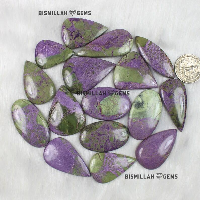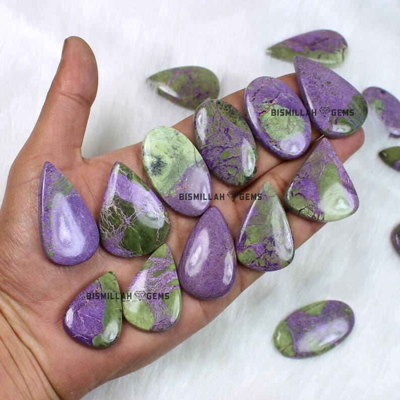 ล็อตพลอยสติชไทต์สีเขียวแบบคาโบชอง รูปทรงและขนาดต่างๆ พลอยสติชไทต์สำหรับทำเครื่องประดับเงิน ขายส่งจำนวนมาก พัวร์ปุริไทต์