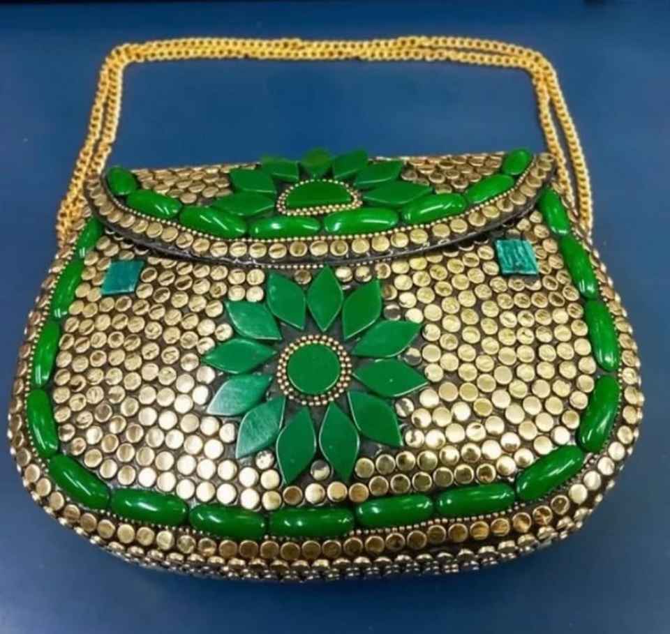 กระเป๋าคลัทช์โลหะสีเขียวดีไซน์หรูหราทำด้วยมือกระเป๋าเงินออกแบบตอนเย็นพร้อมส่งสีเรซิ่นโมเสกทองเหลืองพร้อมโลหะ