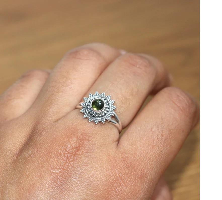 แหวนพลอยทัวร์มาลีนสีเขียว925อัญมณีเงินสเตอร์ลิงเครื่องประดับธรรมชาติงานแฮนด์เมดดีไซน์เรียบง่าย