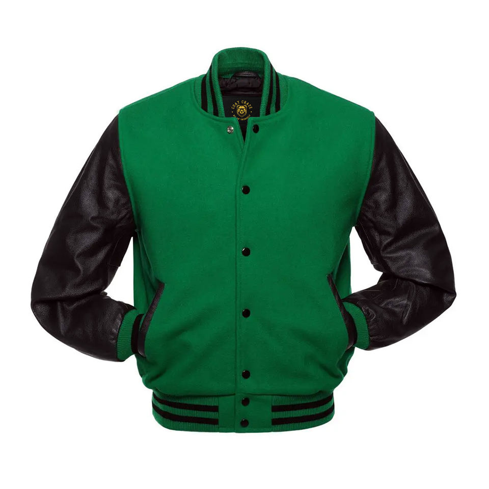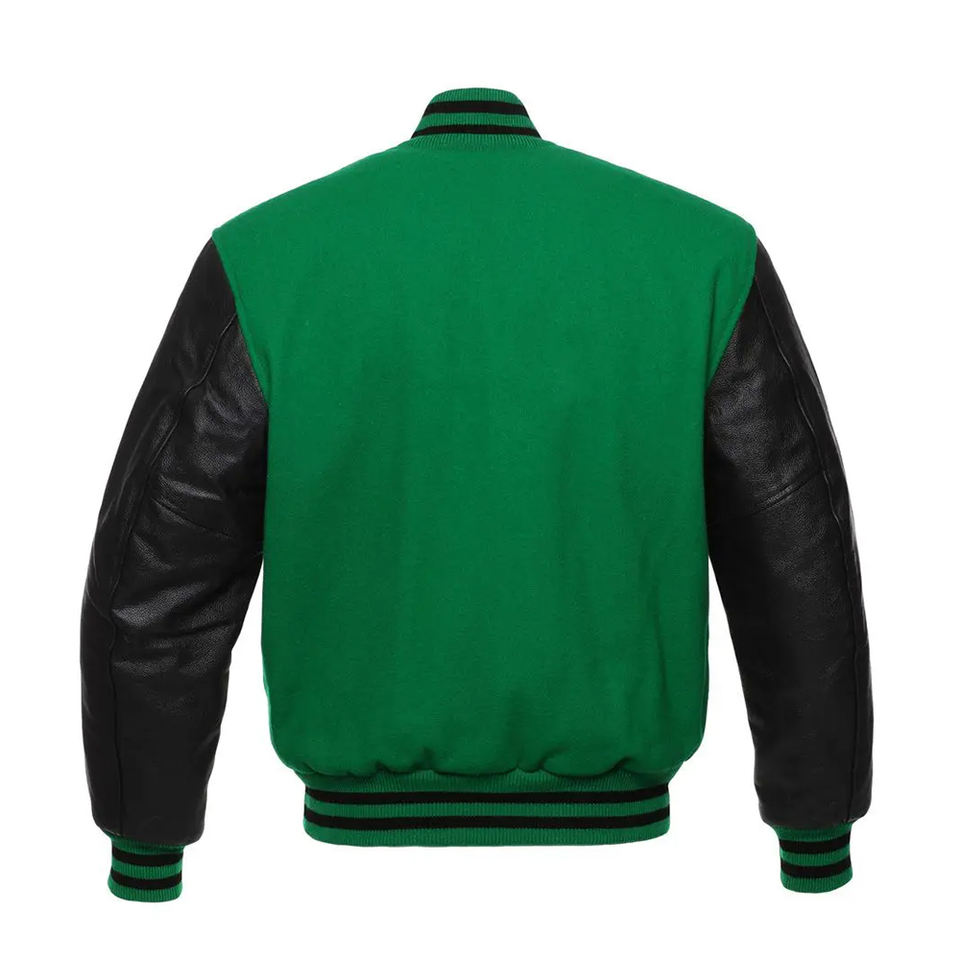 แจ็คเก็ตบอมเบอร์สีเขียวแบบวาร์ซิตี้ แจ็คเก็ตเลตเตอร์แมน แขนหนัง ขายส่ง แจ็คเก็ตเลตเตอร์แมนแบบกำหนดเอง แจ็คเก็ตวาร์ซิตี้หนังสำหรับผู้ชาย