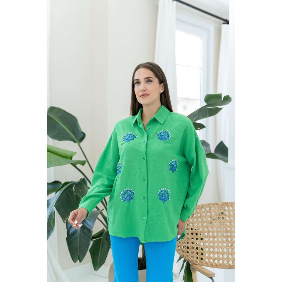 เสื้อโปโลผู้หญิงสีเขียว ปักลายเปลือกหอยสีน้ำเงินและประดับด้วยคริสตัล ผ้าฝ้ายถัก 100% ระบายอากาศได้ดี