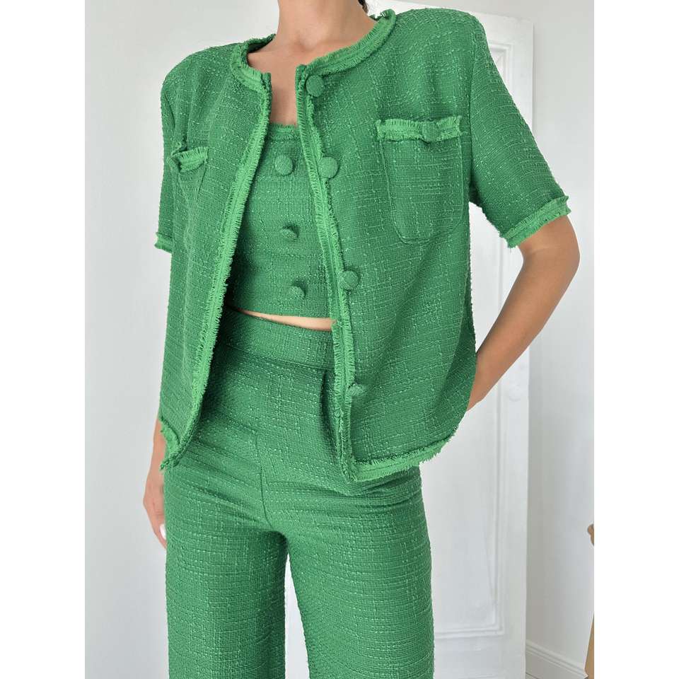 ชุดสูทผู้หญิงสีเขียว ผ้าโพลีเอสเตอร์ทอ ระบายอากาศได้ดี กางเกงขายาวและเสื้อแจ็คเก็ตแขนสั้น ชุดสองชิ้น