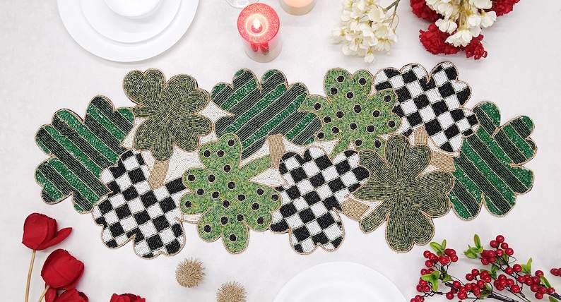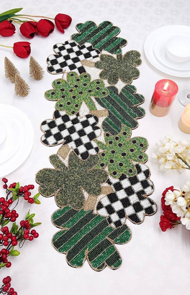 ผ้าปูโต๊ะลูกปัดทำด้วยมือพร้อมใบโคลเวอร์สีเขียวอุปกรณ์ตกแต่งที่ปรับแต่งได้ไม่เหมือนใคร