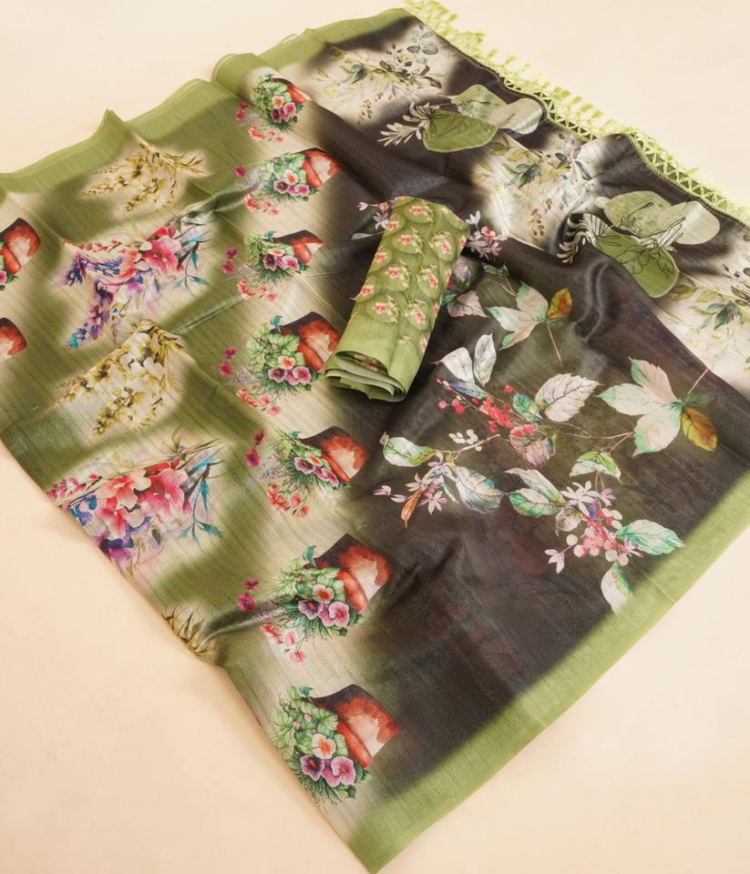 ส่าหรีผ้าไหมสีเขียววัสดุ