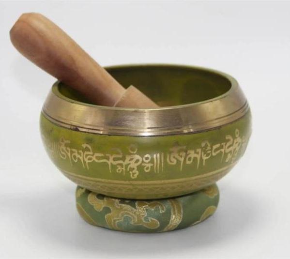 สีเขียวที่มีสีนูนหรือค้อนร้องเพลงชามสำหรับสุขภาพและเสียงเรียกเข้าขลัง