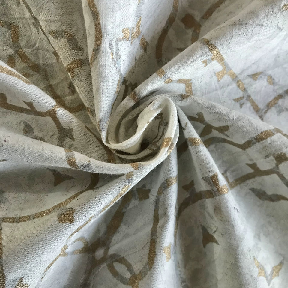 ผ้าฝ้ายพิมพ์ลายเรขาคณิตสีเทาเบจด้วยมือ