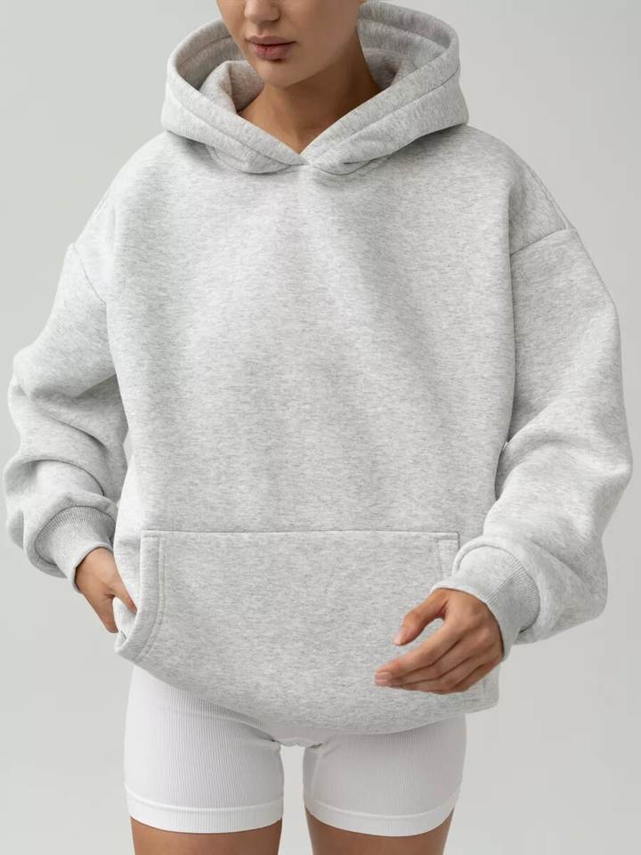 เสื้อฮู้ดผู้ชายสีเทาแบบโอเวอร์ไซส์ สวมใส่สบาย มีกระเป๋า ผ้าฟลีซนุ่ม ระบายอากาศได้ดี เป็นมิตรต่อสิ่งแวดล้อม