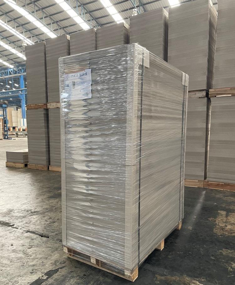 แผ่นกระดาษลามิเนต Chipboard สีเทาบนพาเลทไม้วัตถุดิบที่ใช้สำหรับไฟล์ซุ้มประตูปกแข็ง