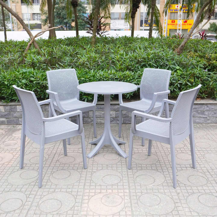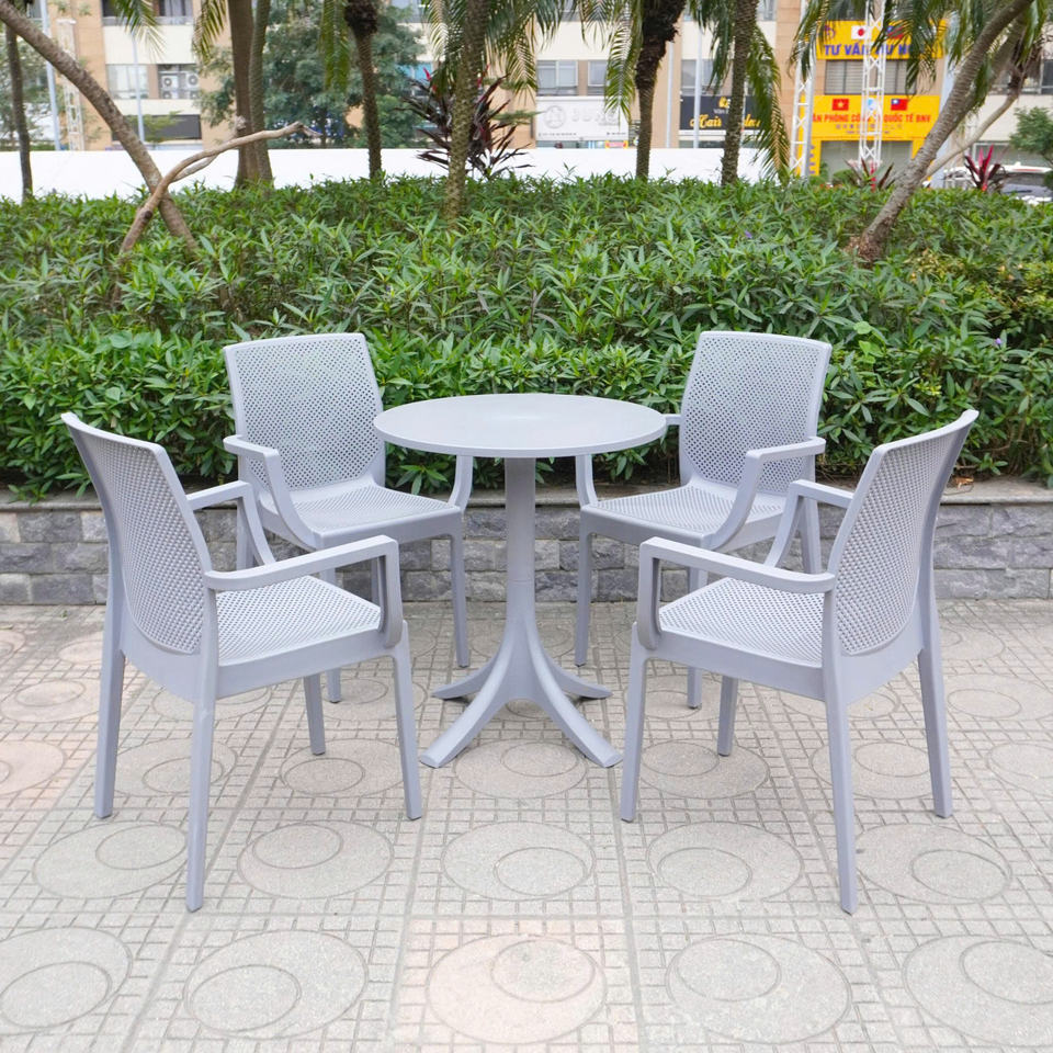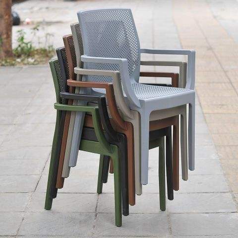 เก้าอี้พลาสติกสีเทาแบบตาข่ายสี่เหลี่ยมขึ้นรูปพร้อมที่วางแขน - เก้าอี้พลาสติกทันสมัยสำหรับสวนยามเย็น