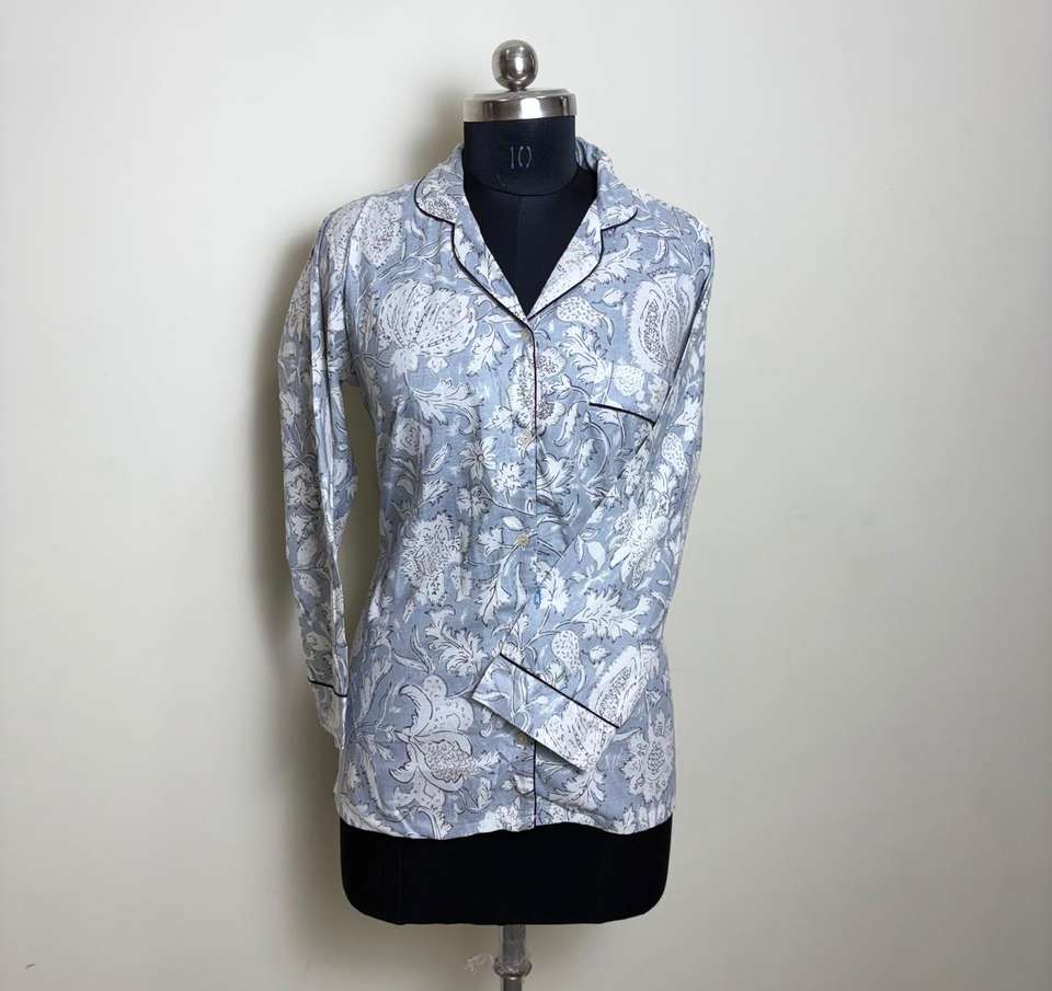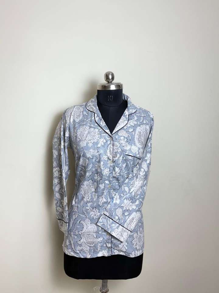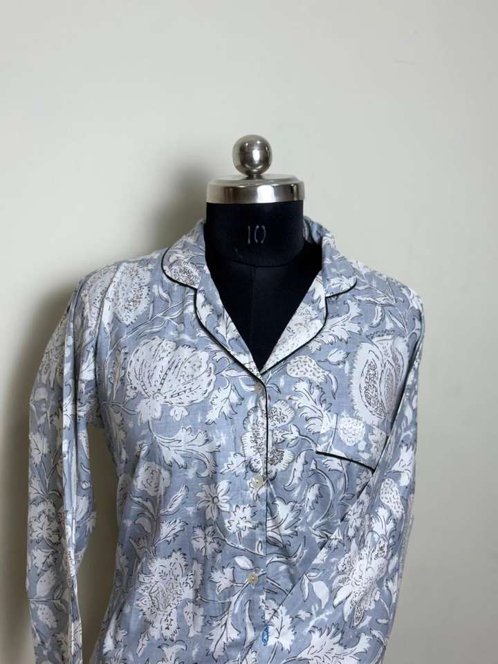 Grey Floral Print Cotton Shirt for Women Womens Long Sleeve Grey Botanical Pattern Shirt