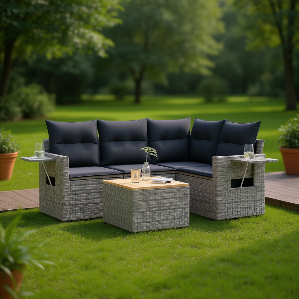 ชุดโซฟาหวายสีเทาสำหรับสวน 4 ที่นั่ง ทนทานต่อสภาพอากาศ เฟอร์นิเจอร์กลางแจ้ง ดีไซน์ร่วมสมัย