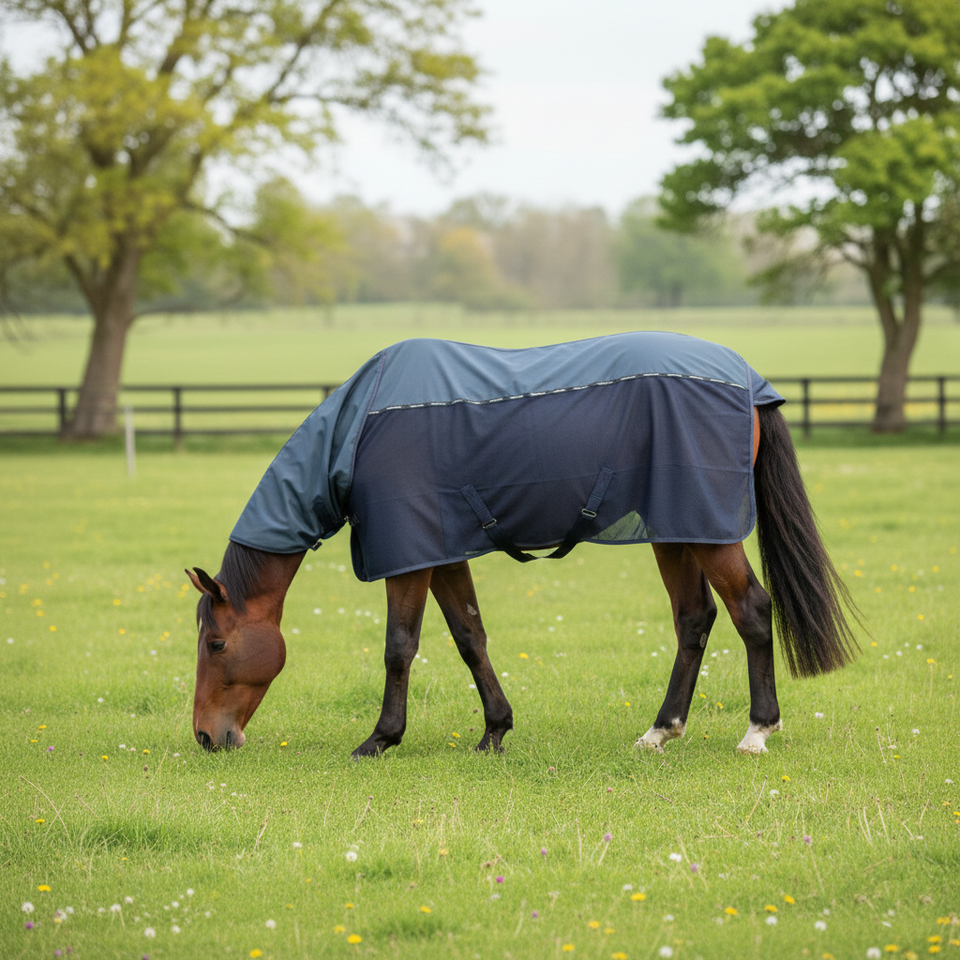 ผ้าคลุมม้ากันน้ำสีเทา ระบายอากาศได้ดี แผงตาข่ายน้ำหนักเบา ผ้าห่มซับเหงื่อ ปรับสายรัดไขว้ได้ ช่วยระบายความร้อนในคอกม้า