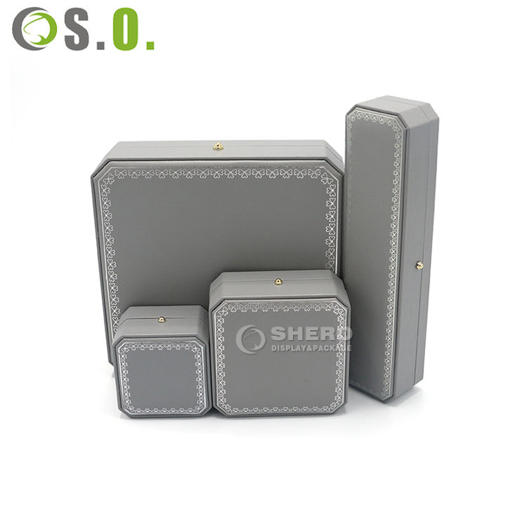 กล่องใส่เครื่องประดับสี่เหลี่ยมสีเทาขายดี ทำจากกระดาษแข็งหุ้มหนัง PU พร้อมโลโก้สั่งทำได้ สำหรับแหวนแต่งงาน ต่างหู และบรรจุภัณฑ์เครื่องประดับ