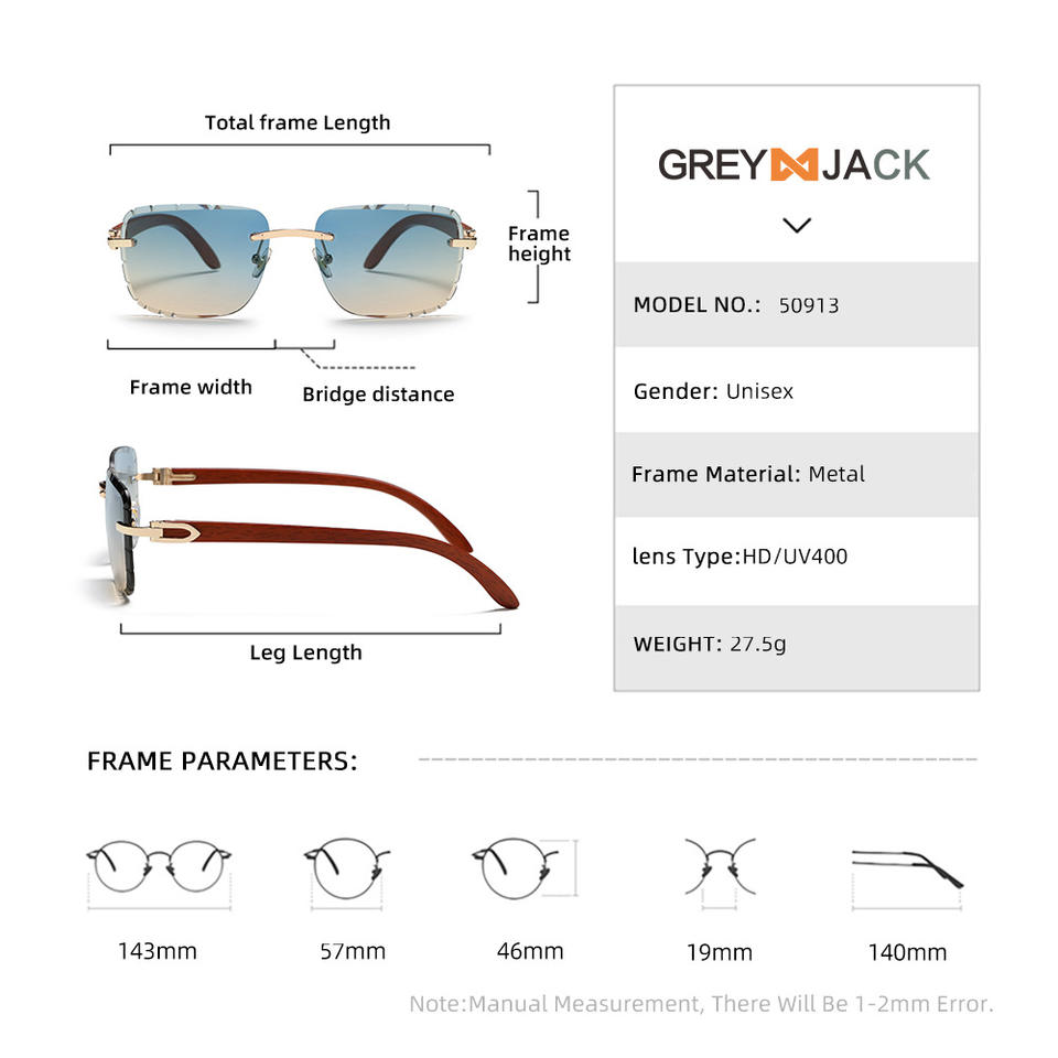 แว่นกันแดดกรอบสีเทา รุ่น Jack Frameless เลนส์ PC กรอบสีทอง ป้องกันรังสียูวี 400 สำหรับทุกเพศ ทรงสี่เหลี่ยม รุ่น 3 Protection