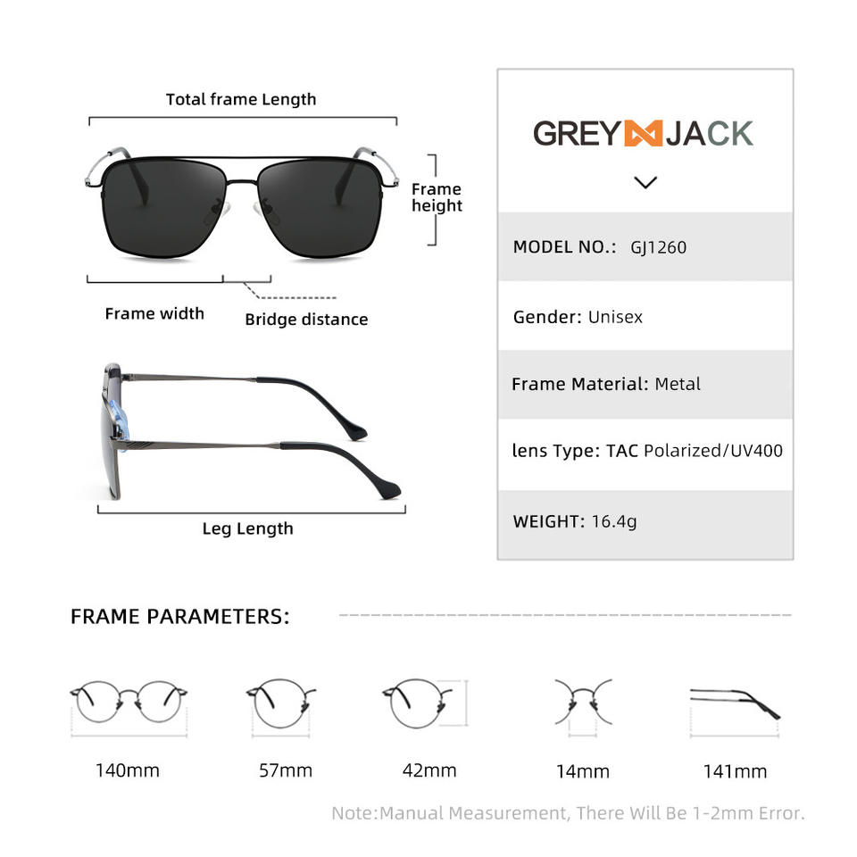 Grey Jack Pilot Sunglasses Unisex Metal Frame TAC Lenses UV400 Protection Full Frame Black Silver Gold