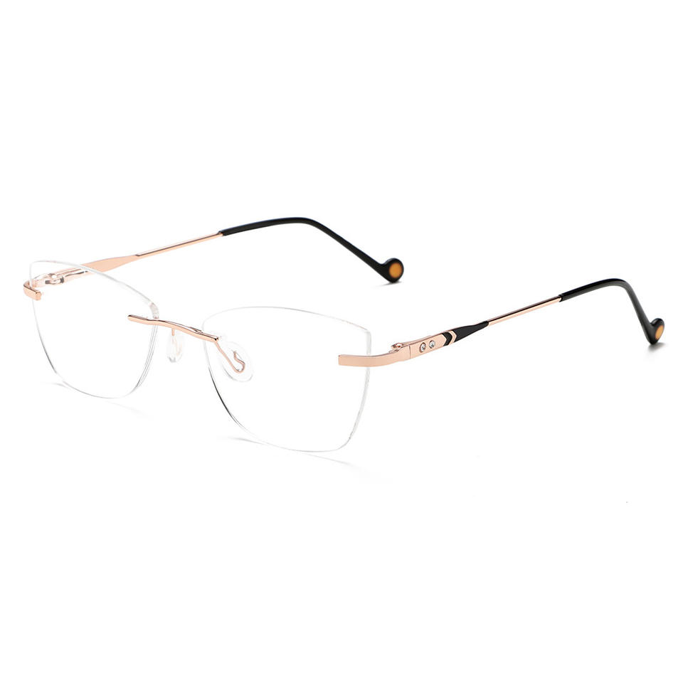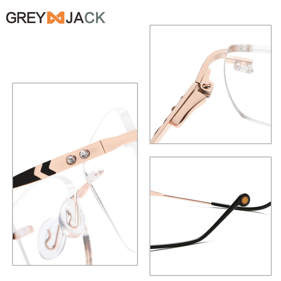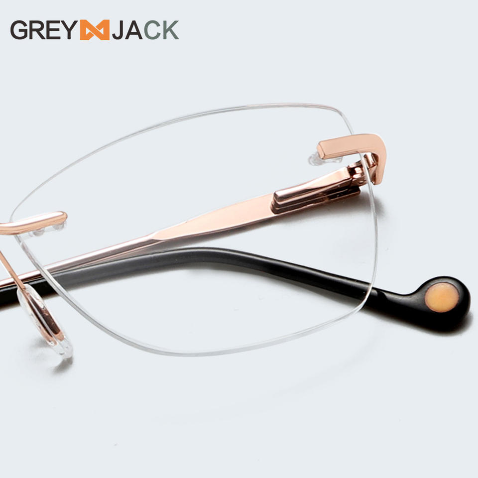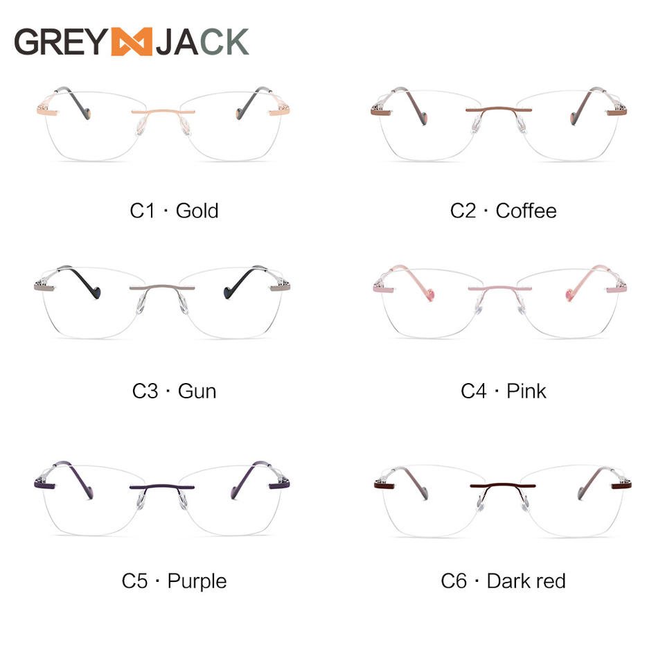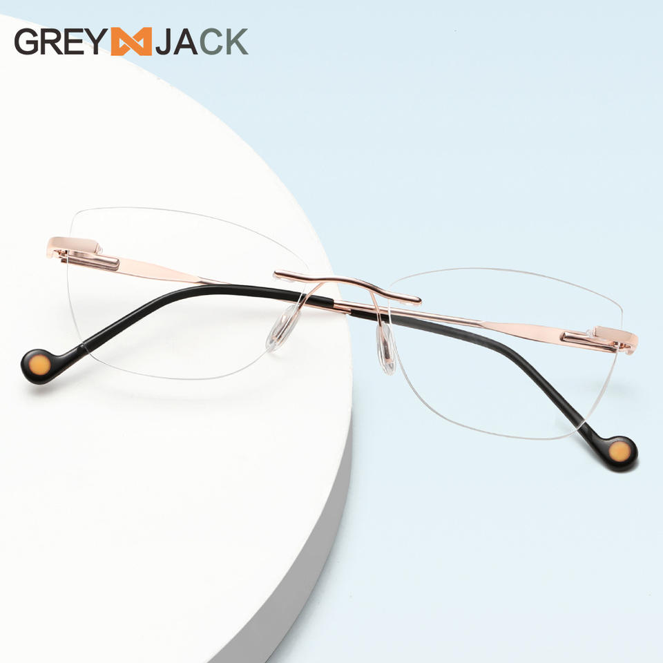 กรอบแว่นตาทรงแคทอายไร้ขอบสีเทาสำหรับผู้หญิง ขาแว่นโลหะแบบสปริง กันลื่น เลนส์อะคริลิค Me2022