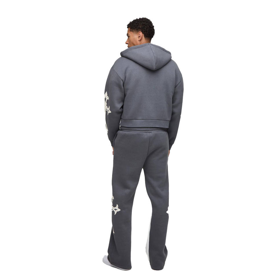 ชุดกีฬาผู้ชายสีเทาเสื้อมีฮู้ดแบบซิปลายกราฟิกมีซิปเสื้อครอปพร้อมกางเกงขาบานผ้าฟลีซชุดสตรีทแวร์เนื้อนุ่มระบายอากาศได้ดี