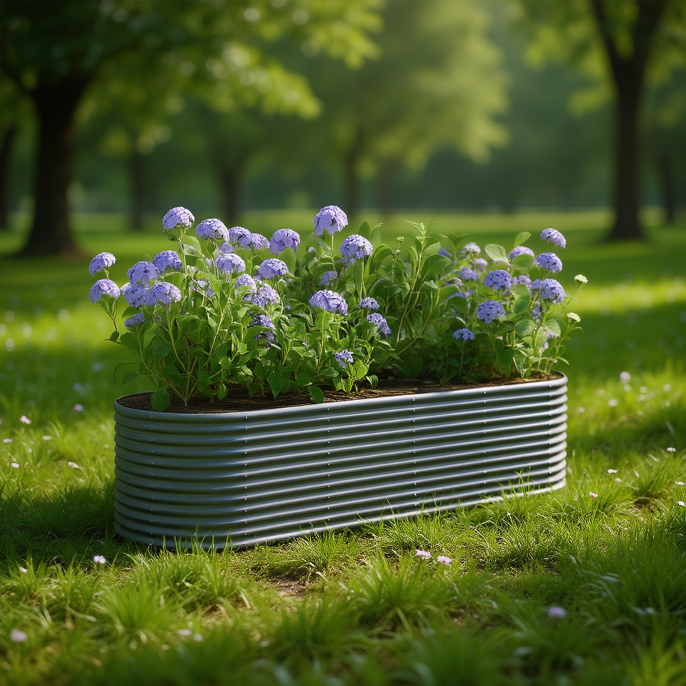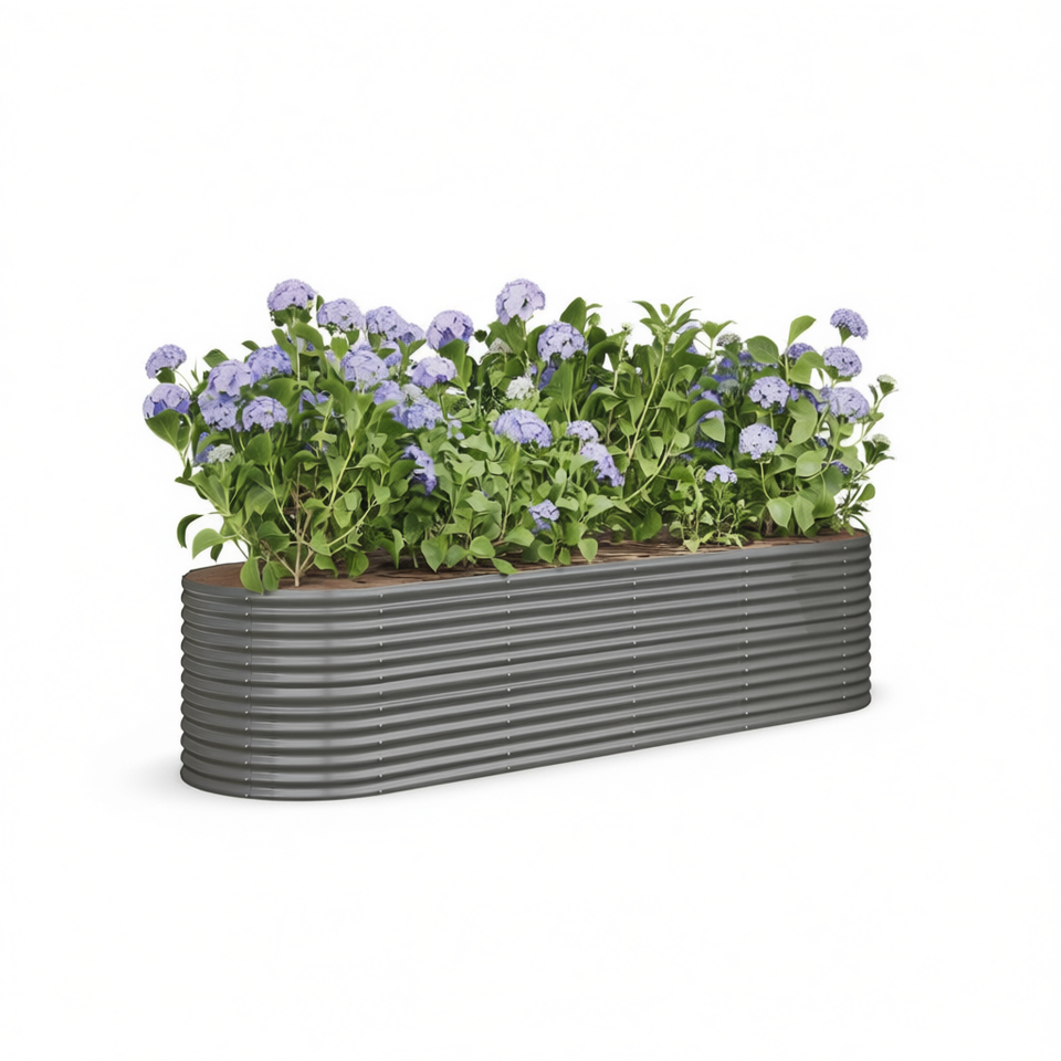 กระถางปลูกต้นไม้ทรงรีแบบยกพื้นสำหรับปลูกดอกไม้และพืชสีเขียว ทำจากเหล็กเคลือบสีเทา
