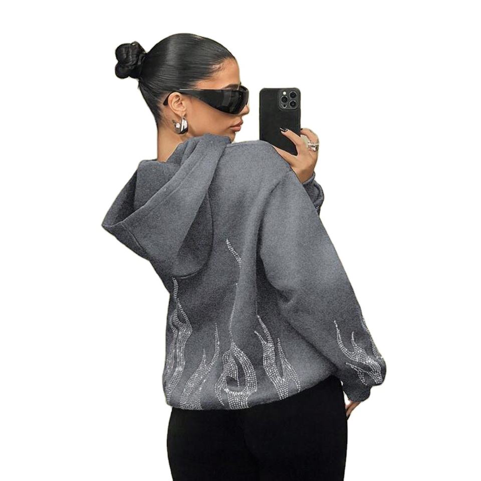เสื้อฮู้ดผู้หญิงผ้าคอตตอนฟลีซซิปรูด420GSM เปลวไฟพลอยเทียมสีเทาเสื้อแจ็กเก็ตแขนเป็นประกาย