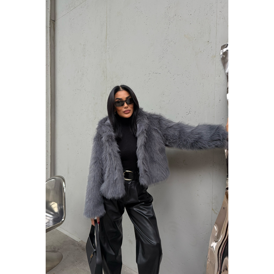 เสื้อโค้ทขนเฟอร์เทียมสีเทาแบบสั้น มีฮู้ด ปิดด้วยซิป ทรงพาร์กา ผ้าขนสัตว์ แต่งลายพิมพ์ทอ บุด้วยใยฝ้าย