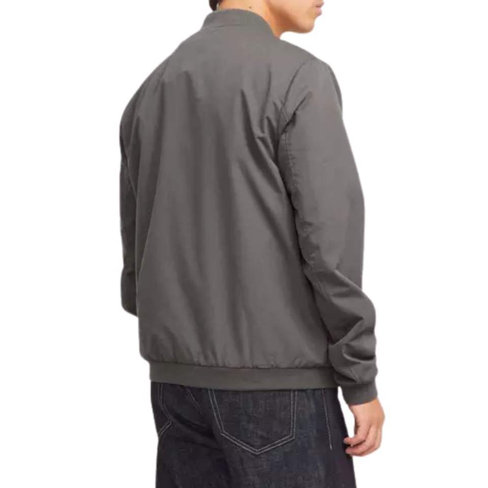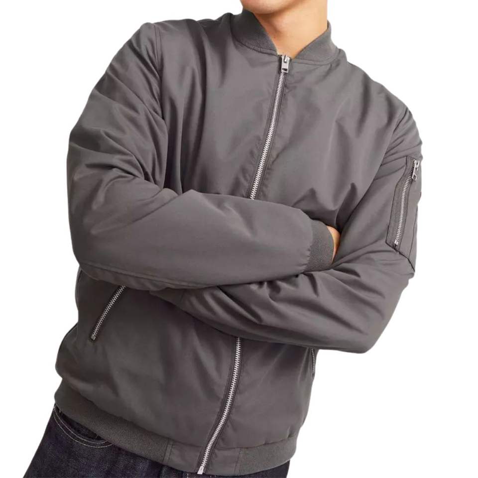 แจ็คเก็ตบอมเบอร์สีเทาสำหรับผู้ชาย ผ้าประสิทธิภาพสูง สไตล์เบสบอล วาร์ซิตี้ กันลม แจ็คเก็ตนักบินลำลองสำหรับกิจกรรมกลางแจ้ง รับสกรีนโลโก้