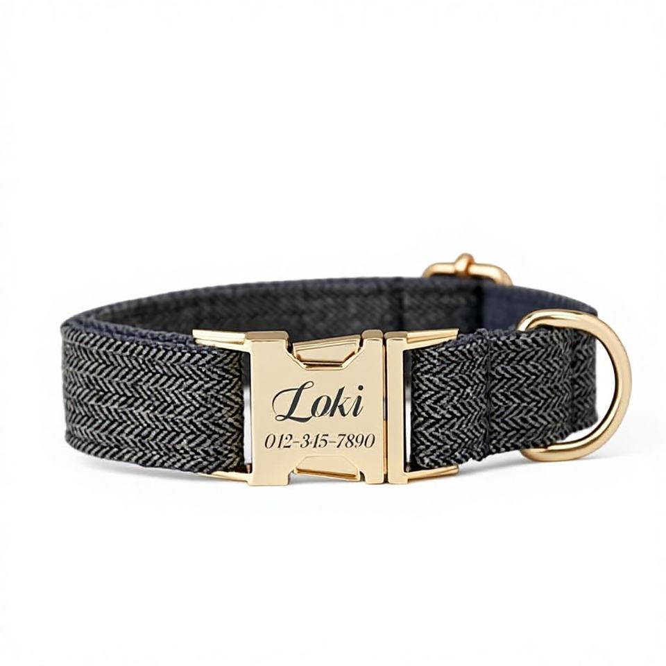 ชุดปลอกคอและสายจูงสุนัขสีเทาแบบทวีด พร้อมป้ายชื่อสัตว์เลี้ยงสลักแบบกำหนดเอง หัวเข็มขัดโลหะสีม่วงอ่อน ของขวัญวันเกิดสำหรับลูกสุนัข ฟรี