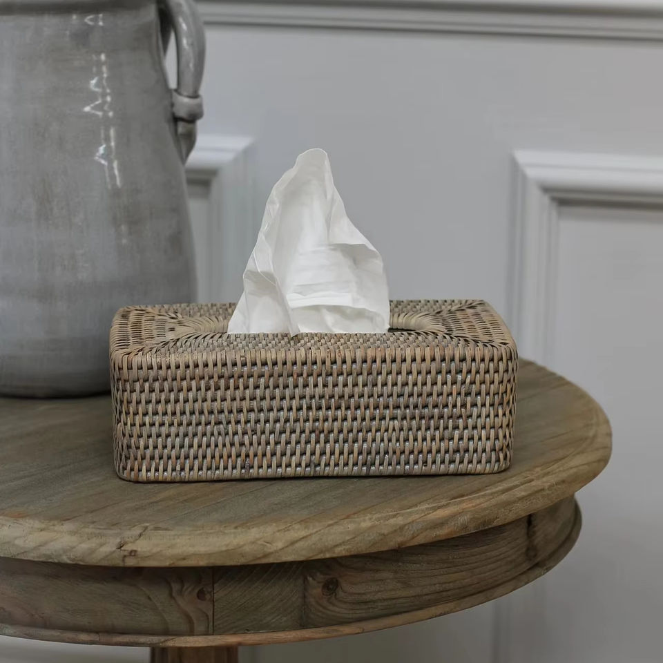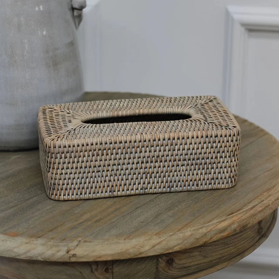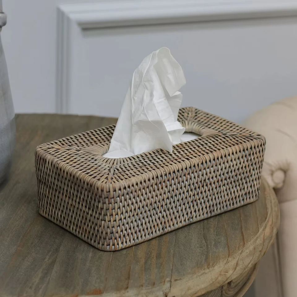 กล่องทิชชู่หวายฟอกสีเทากล่องใส่ของแฮนด์เมดเป็นมิตรกับสิ่งแวดล้อมของตกแต่งบ้านและบ้านจากเวียดนาม