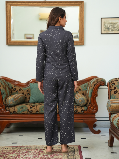 ชุดนอนผ้าเรยอนพิมพ์ลายจุดสีเทาสำหรับผู้หญิง คอเสื้อเชิ้ต แขนยาว ออกแบบด้วยผ้าเนื้อนุ่ม สวมใส่สบาย
